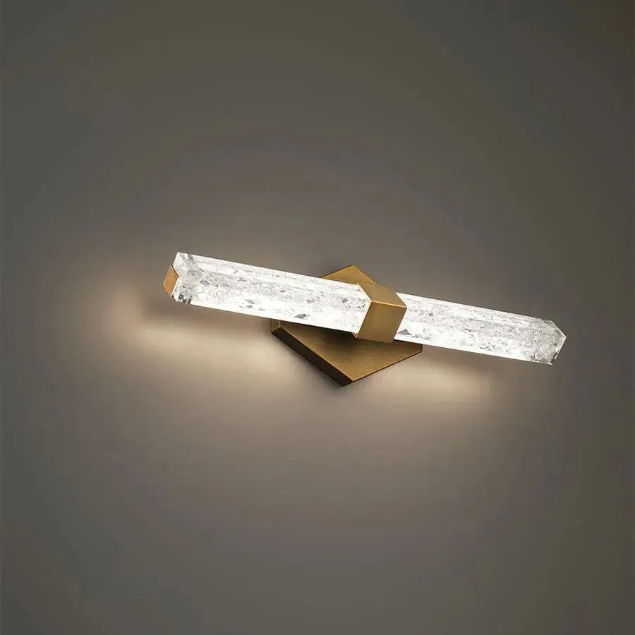 Artisanal reclaimed crystal shards glitter with ample ambient illumination. LEDs illuminate the crystal shards frozen within this dramatic bath sconce. Installs in either horizontal or vertical directions depending on your needs