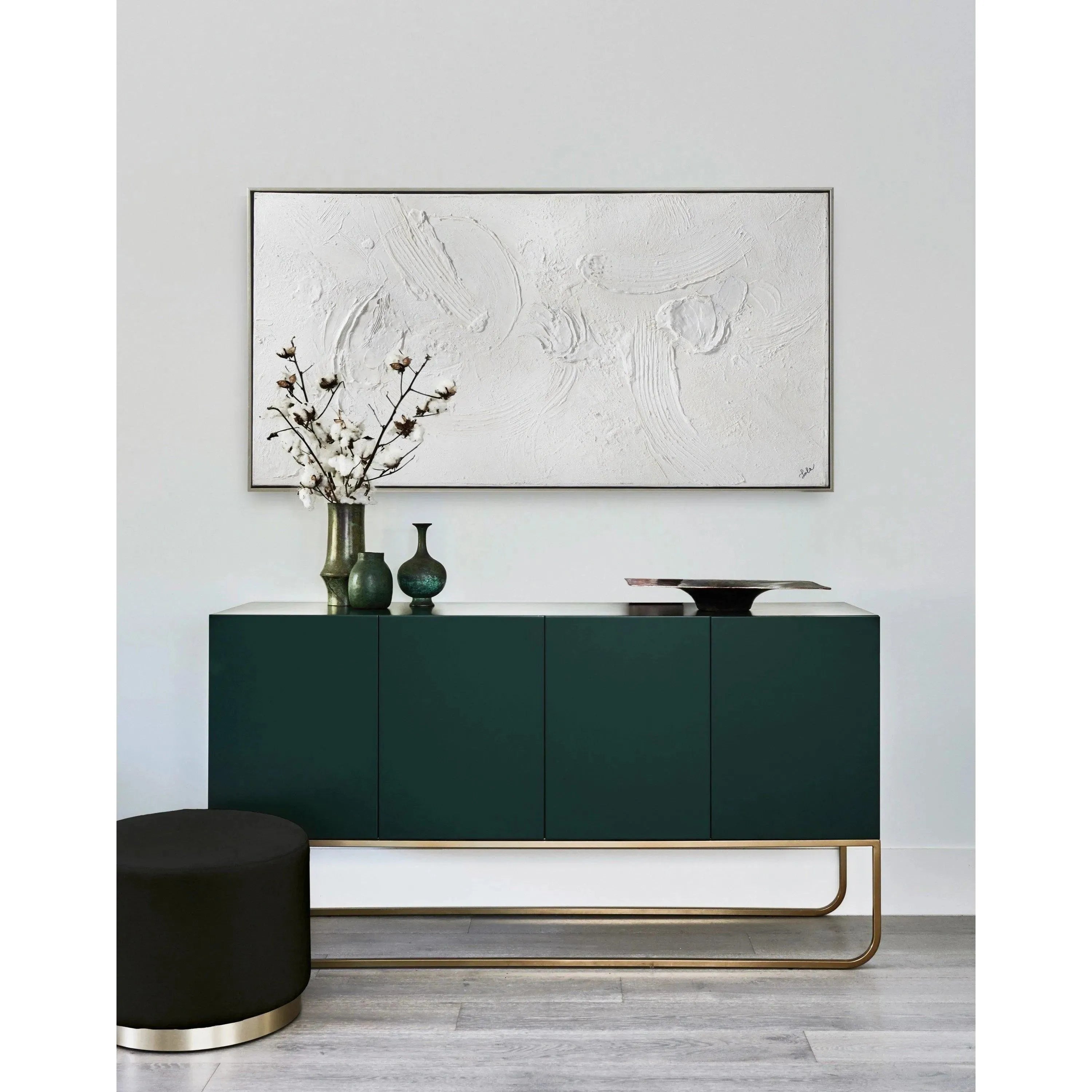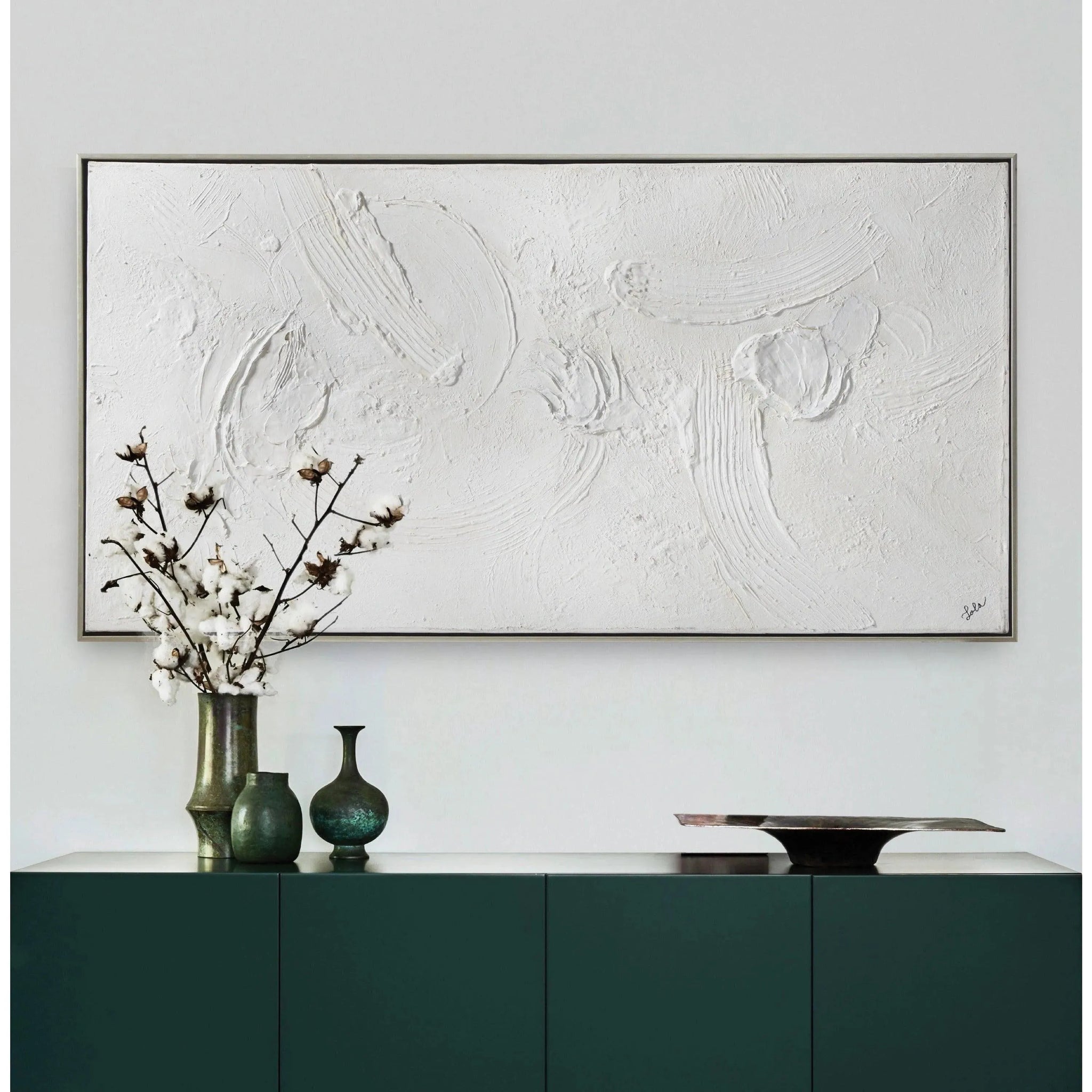 Simple in concept yet striking in design, this all-white painting casts a bold impression within the contemporary interior. With eye-catching textures sweeping across the canvas this piece needs no colour to feel complete.