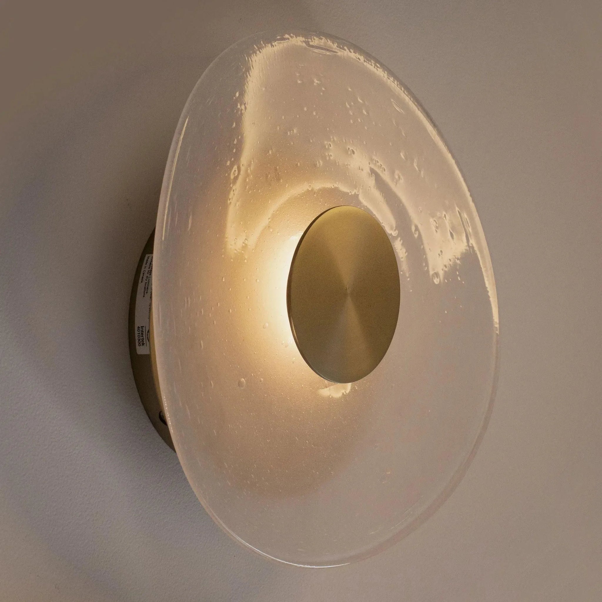 Iris Wall Light designed by Ridgely Studio Works, is a sleek contemporary piece. The soft light radiates outward from the center to create a warm glow in any room of your home. Hand blown Frosted Seeded glass is complimented by a Brushed Brass, Satin Nickel, Copper, Polished Nickel, Bronze, or Blackened Steel finish. Perfect as a stand alone or grouped together for your own unique look. ADA compliant. CSA listed. ETL listed.