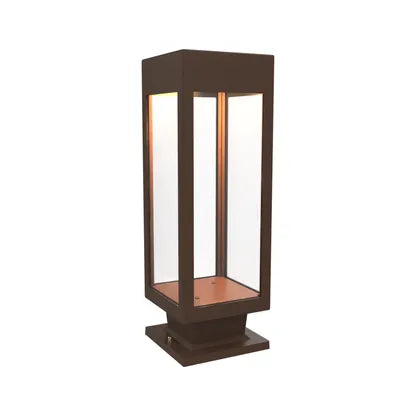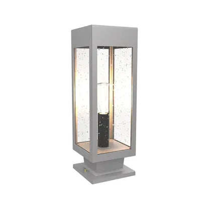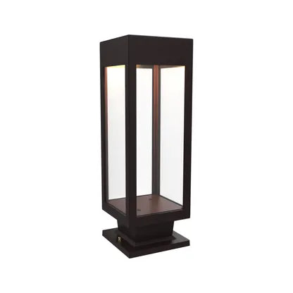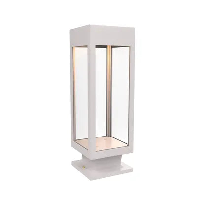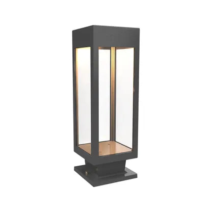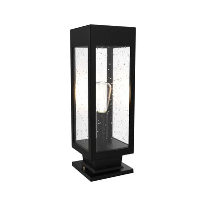 SNOC Stockholm Medium Pedestal Mount elevates outdoor and transitional interiors with a pared-back, architectural silhouette. The tall, rectangular lantern reads as modern sculpture — clean matte-black metal framing transparent glass panels that expose a single, elegant filament lamp for warm, focused illumination.