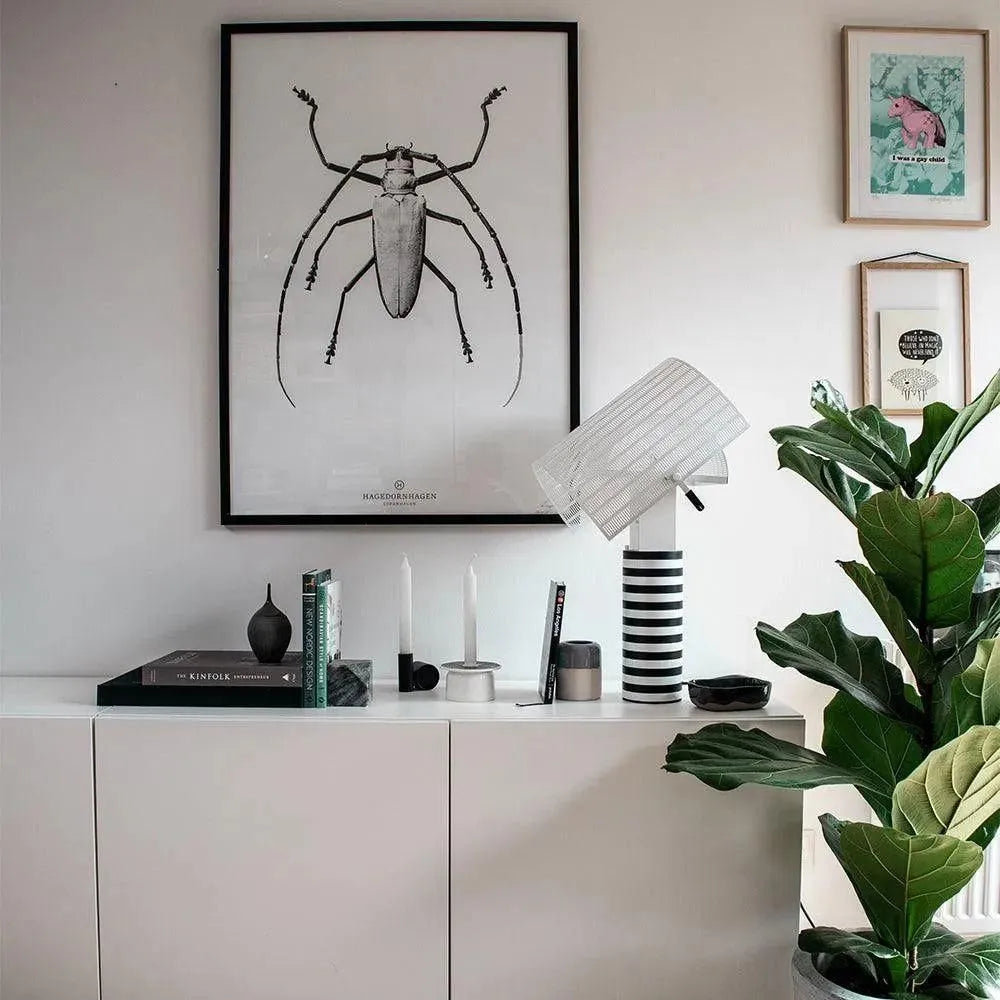 With its bold black and white stripes, Shogun creates a strong graphic presence with its contrast. Its diffuser is crafted of perforated steel, which diffuses a soft light through the tiny holes creating an interesting pattern of light and shadow.