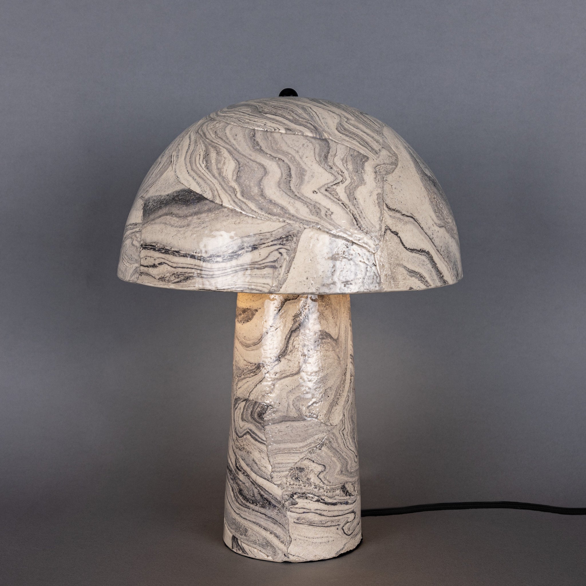 Amanita Ceramic Table Lamp by Mullan Lighting is a sculptural study in form and finish — a mushroom‑inspired silhouette rendered in hand‑glazed ceramic that reads like natural stone. The domed shade and tapered column flow as a single, tactile object with a marbled, high‑gloss surface that diffuses light evenly while acting as a strong visual anchor.