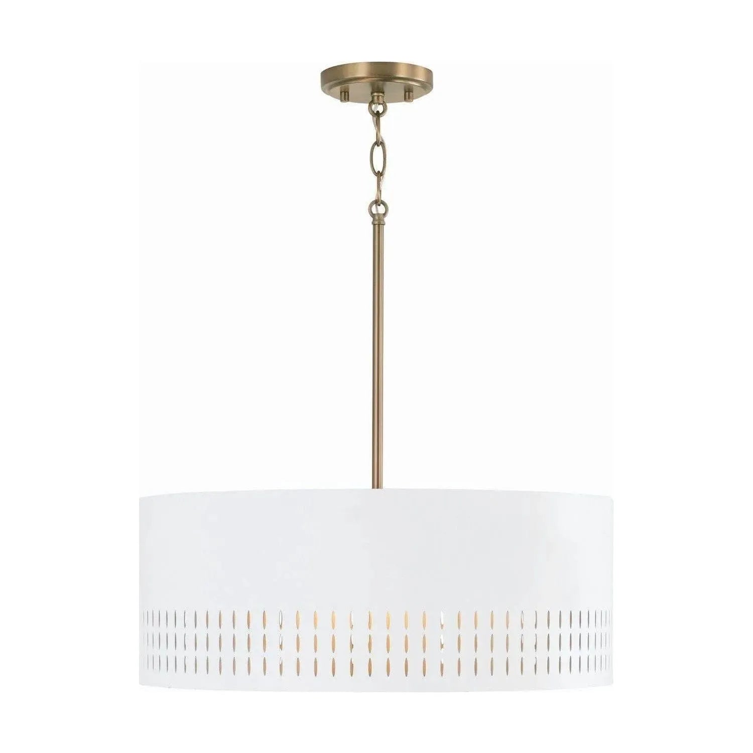 The Dash Pendant redefines mid-century charm with a bold, modern silhouette. The Dash Medium Pendant fuses mid-century style with durable metal, featuring a smooth White finish and distinctive cut-outs that add character. Inside, aged brass brings a warm backdrop, adding depth and a subtle glow that makes this pendant a standout centerpiece for any room.