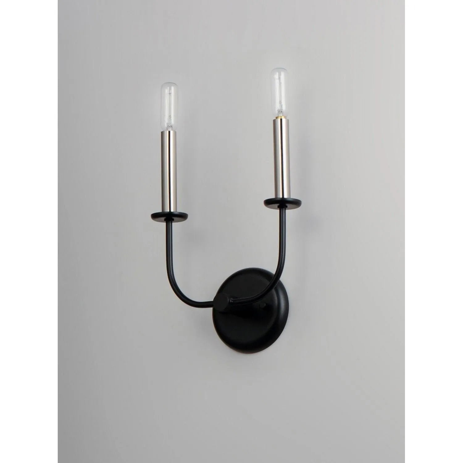Wesley Wall Sconce by Maxim Lighting is a minimalist study in line and proportion—designed to deliver refined, directional light with discreet presence. The slender cylindrical finial and polished metal socket rise from a gracefully curved matte black arm, anchored by a compact round backplate for a clean, architectural silhouette.