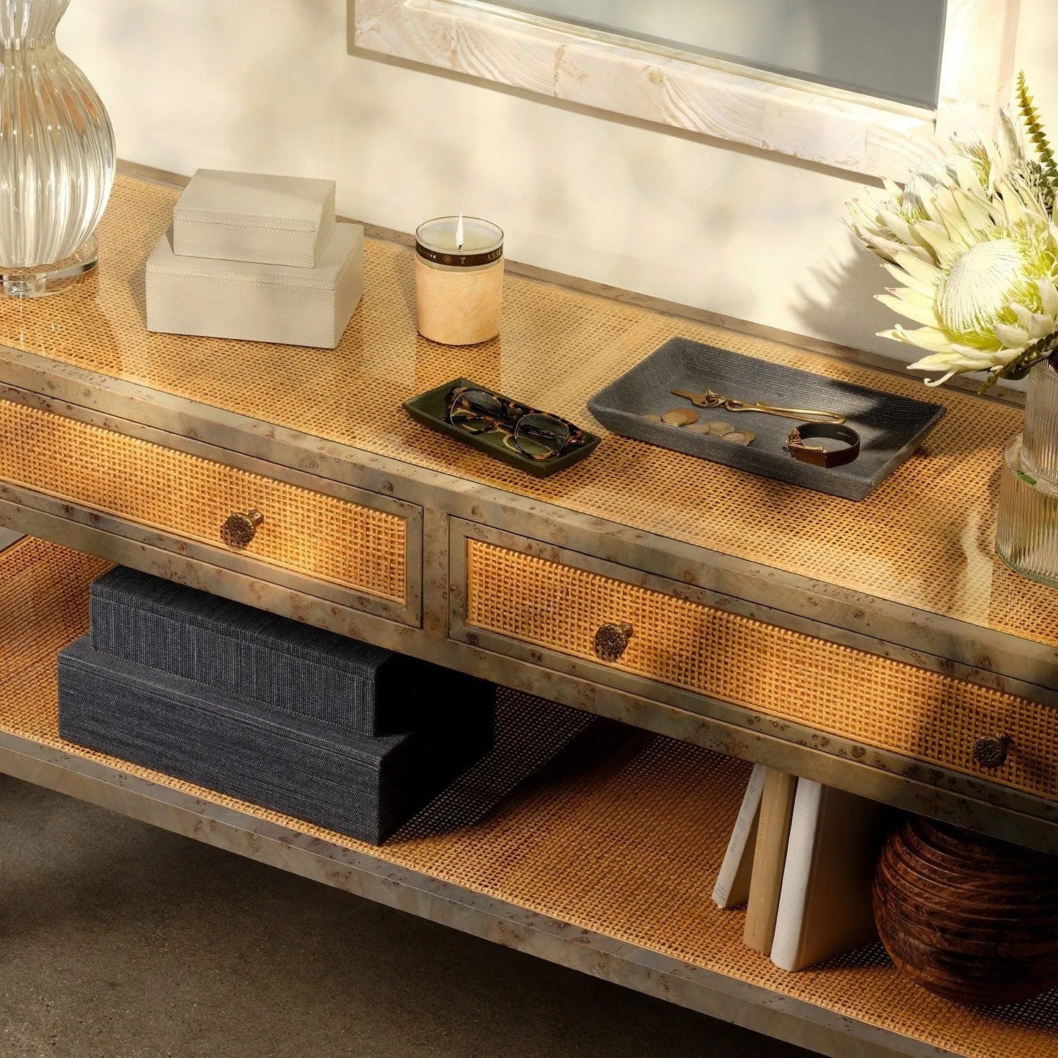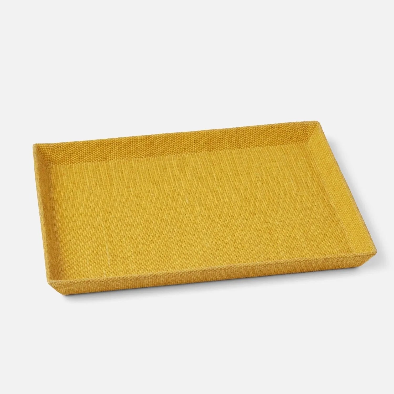 Simple and sophisticated, our slanted-edge Dresden tray has touchable warmth, thanks to a textured cotton jute covering. Available in a plethora of colorful finishes.