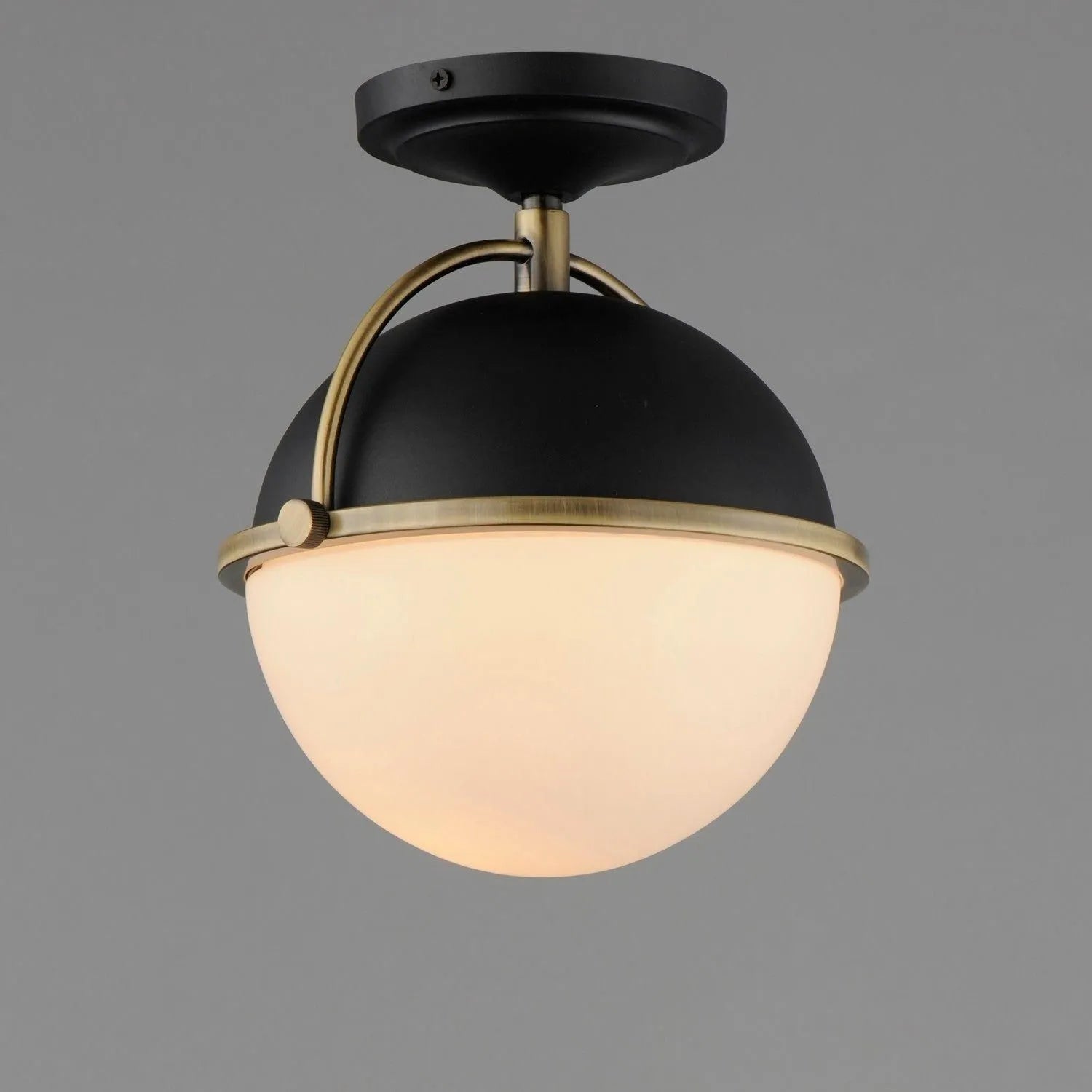 Tasteful globes constructed of metal and glass halves are combined and suspended by an arc-shaped yoke structure. The top dome of robust steel support lower halves of Satin White glass shades that twist lock on for convenience of installation and maintenance. Available in Matte Black with contrasting Weathered Brass or Satin Nickel with Satin Brass two tone finishes, the series includes a full range of products including flush mount, semi-flush mount, single and multi-pendant configurations, and spec-worthy sconces. This attractive design is sure to enhance your projects most needed spaces with an enduring appeal to the design that works in a variety of aesthetics.