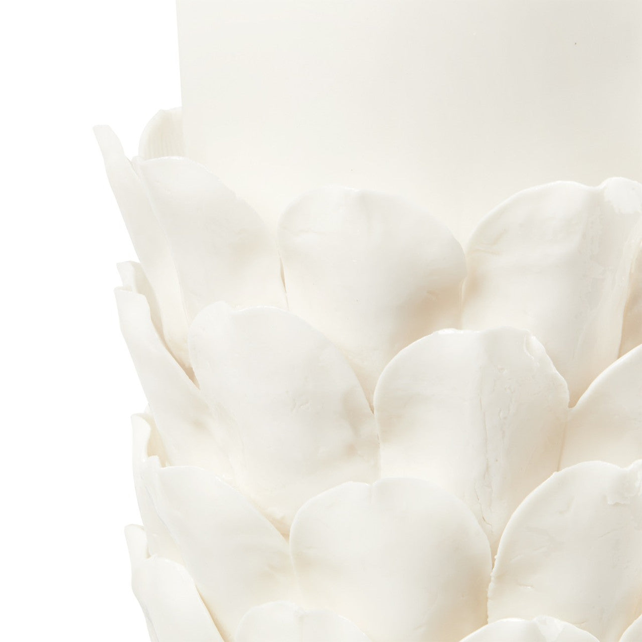 The Jasmine Lamp is an artistic touch for any space. Its long and slender shape lifts the eye while its ivory tonality compliments the gold-leaf. Several rows of thin, almost translucent, hand-crafted Blanc de Chine petals are applied to a matte porcelain lamp base contrasting with the simplicity of its silhouette. The Jasmine Lamp works beautifully as a stand-alone piece in any room and a pair would make a romantic and sophisticated statement on top of an entryway or living room console. Please note: Villa & House's lamp shades are sold separately. The Jasmine Lamp is an artistic touch for any space. Its long and slender shape lifts the eye while its ivory tonality compliments the gold-leaf. Several rows of thin, almost translucent, hand-crafted Blanc de Chine petals are applied to a matte porcelain lamp base contrasting with the simplicity of its silhouette. The Jasmine Lamp works beautifully as a stand-alone piece in any room and a pair would make a romantic and sophisticated statement on top of an entryway or living room console. This lamp is topped with a crisp white laminated linen shade, accented with brass hardware.