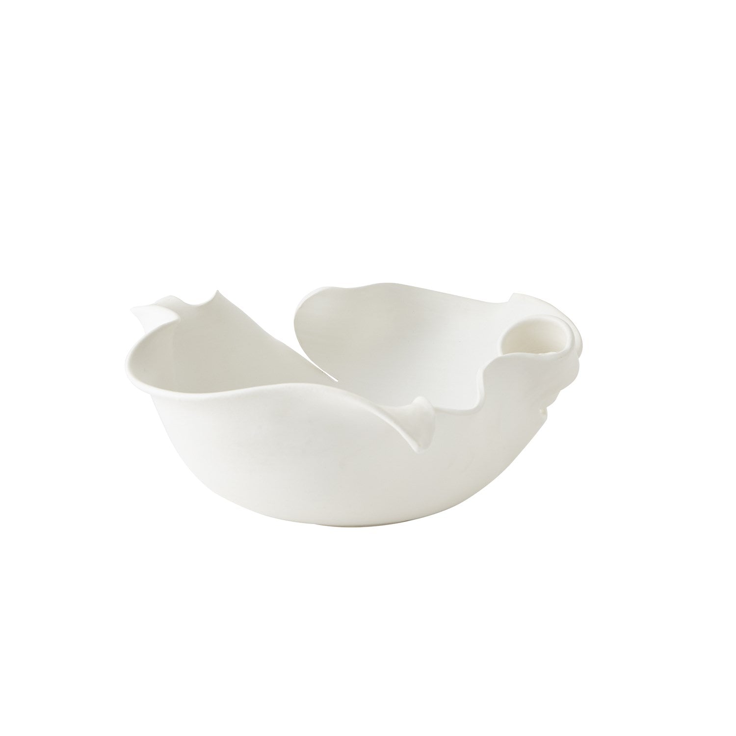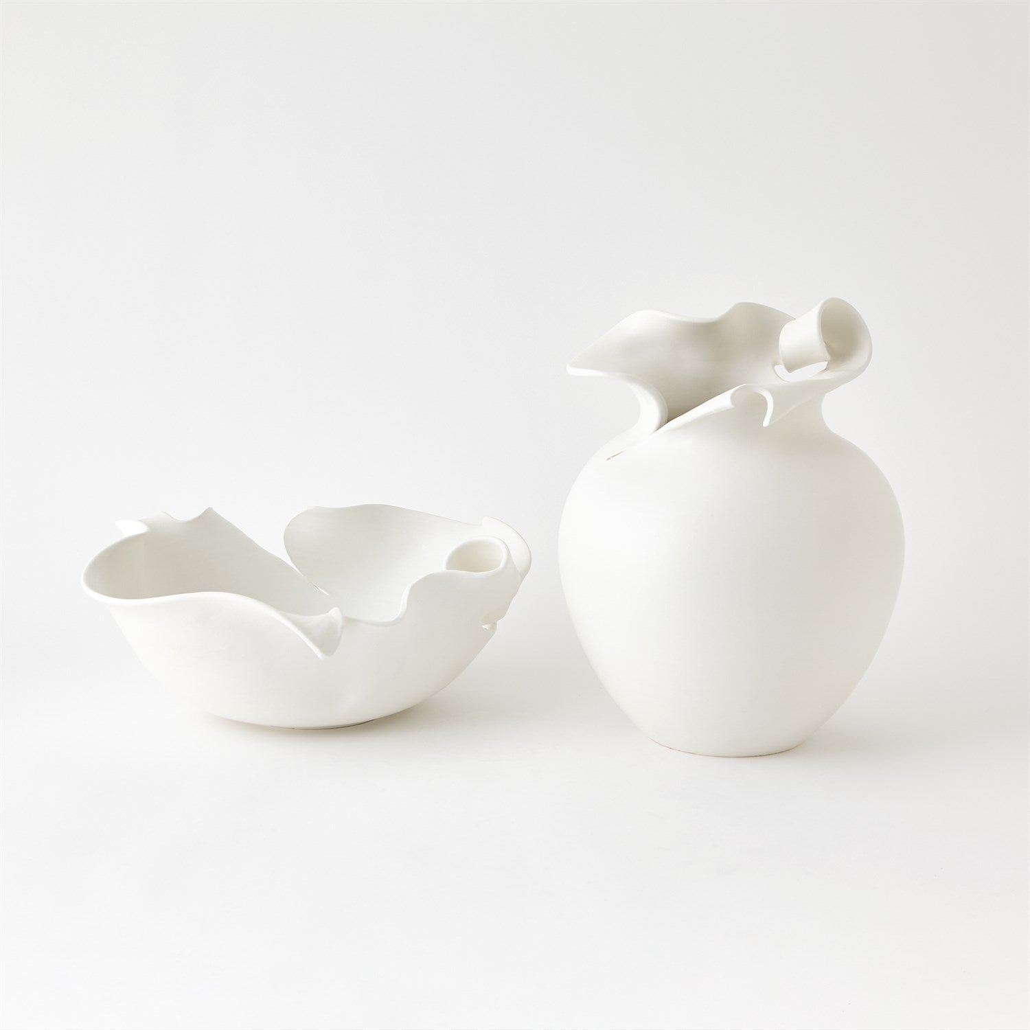 The fluid folds and sinuous shape of our Charlotte Vase and Bowl make a beautiful, sculptural statement. Handmade in Italy by a master ceramic artist, this design has a milky white satin glaze with a luminous quality. Due to the handmade nature of this item, sizes can vary slightly.