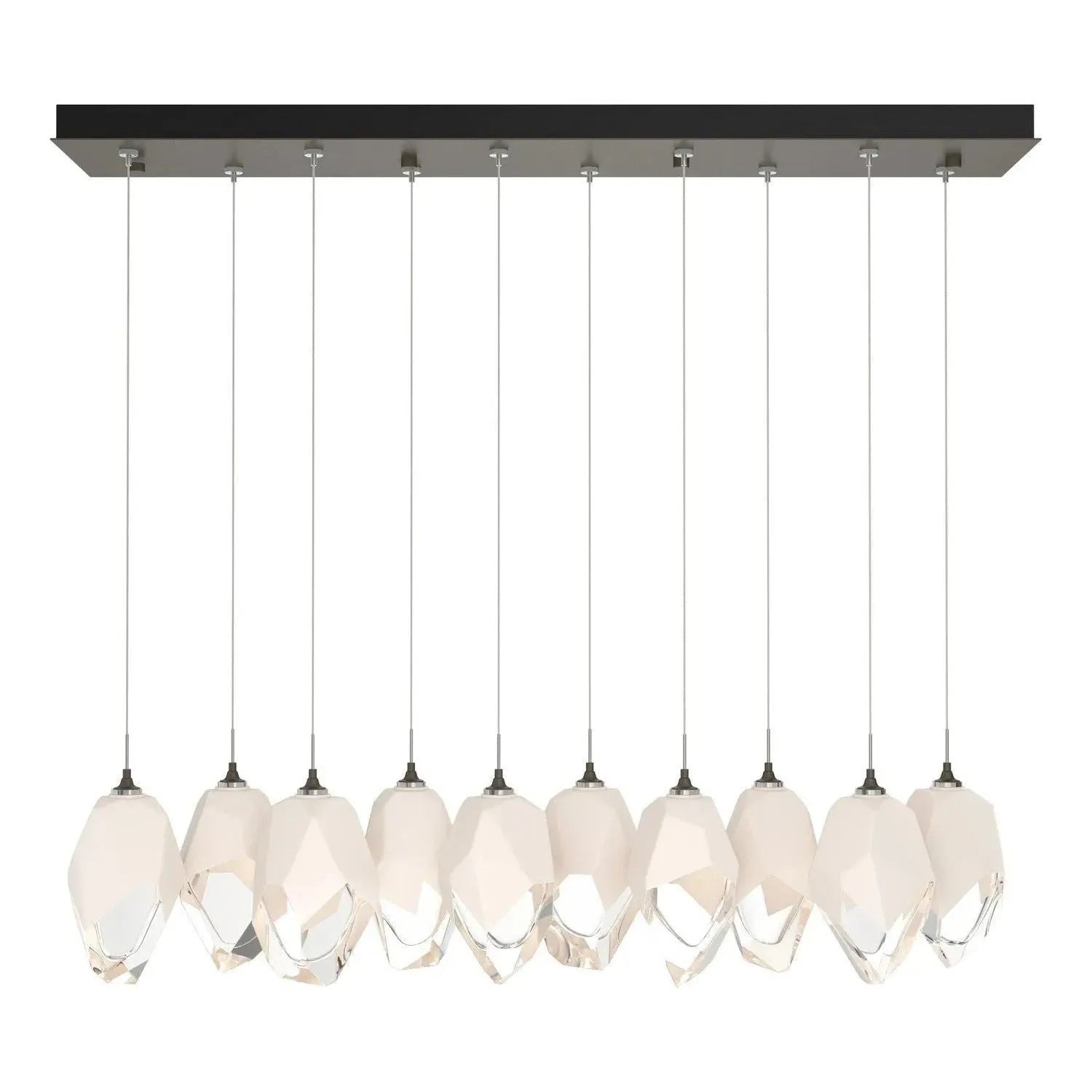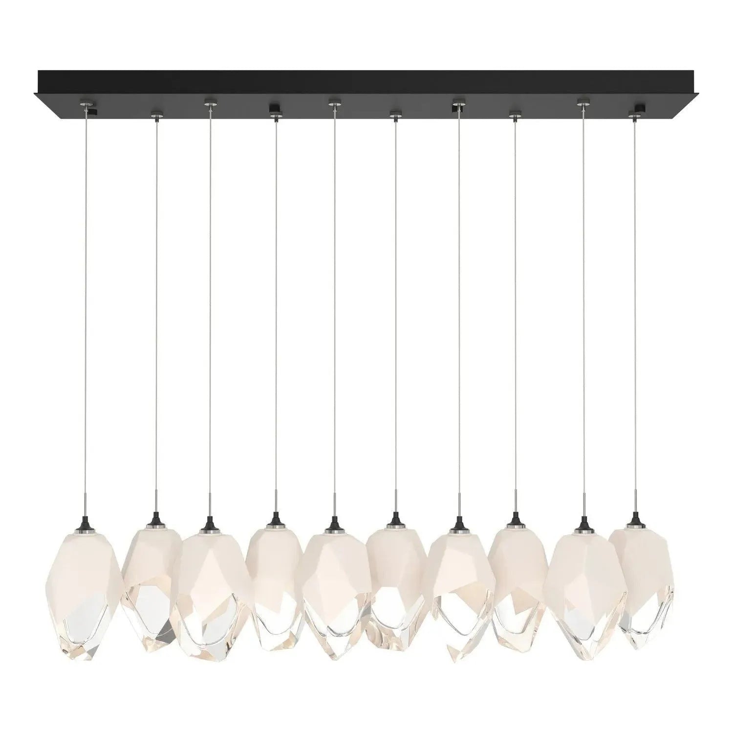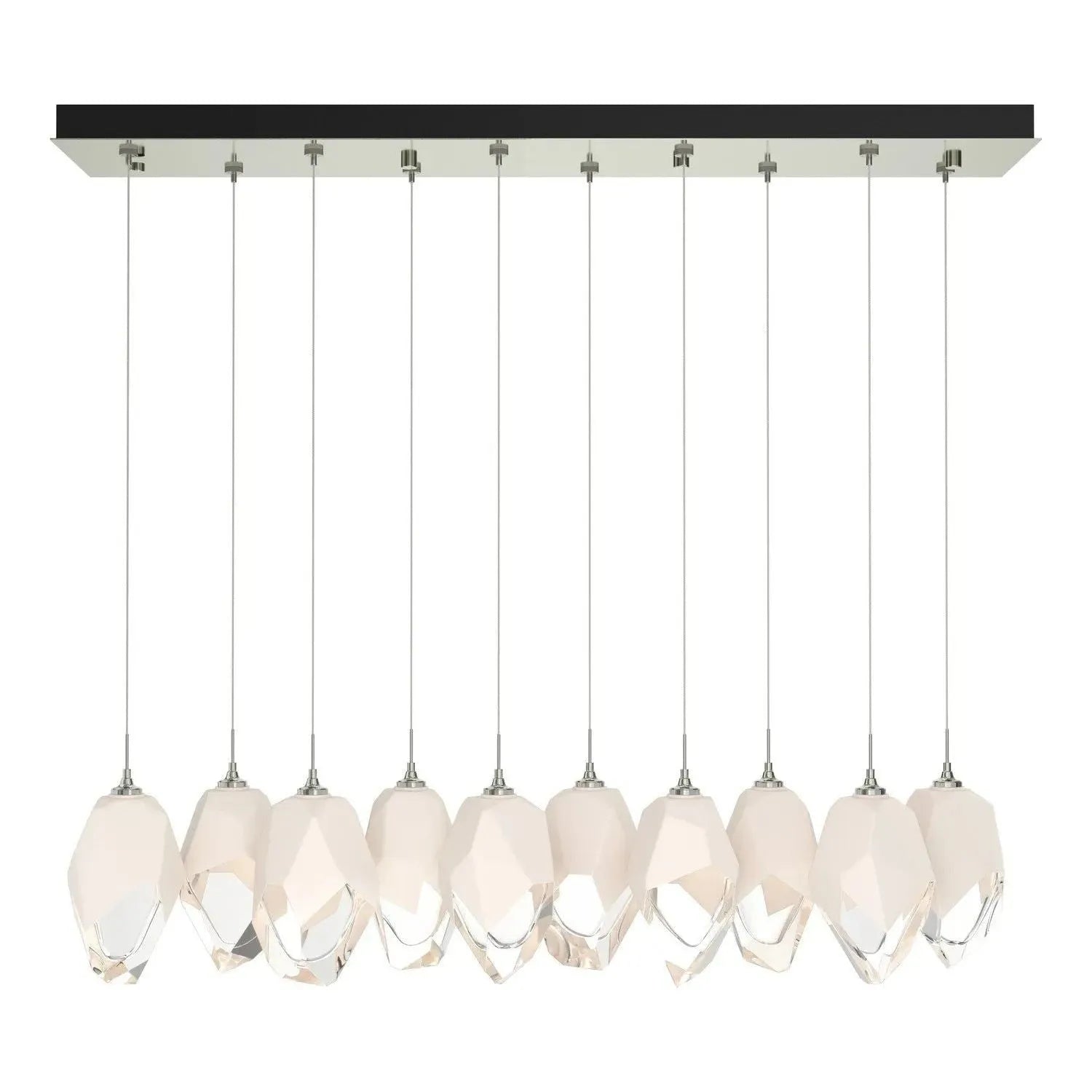 Ten Large Chrysalis pendants hung from a rectangular canopy. Each pendant may be individually adjusted for a custom look. Note, the upper canopy can will always be black while the canopy faceplate will match the selected finish.