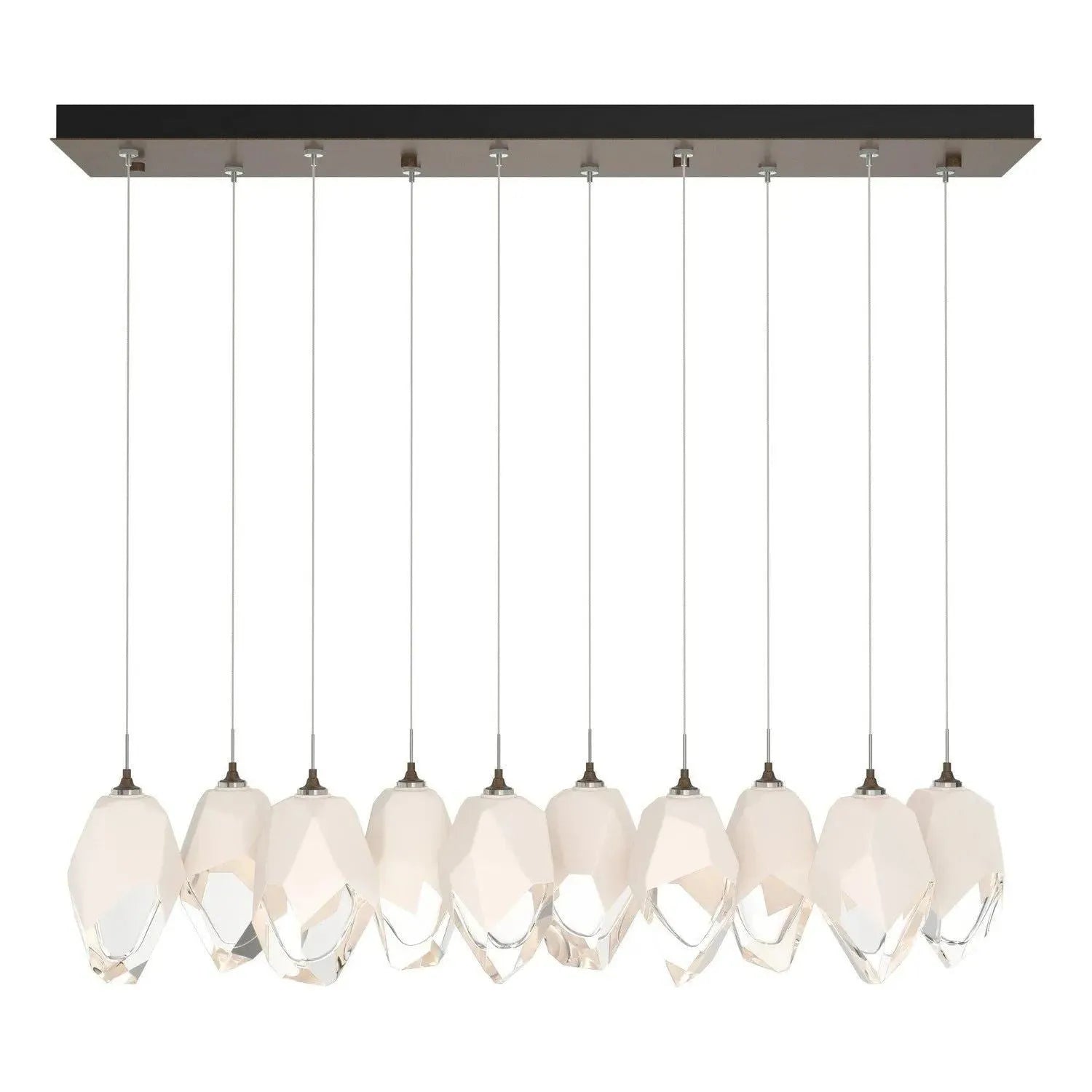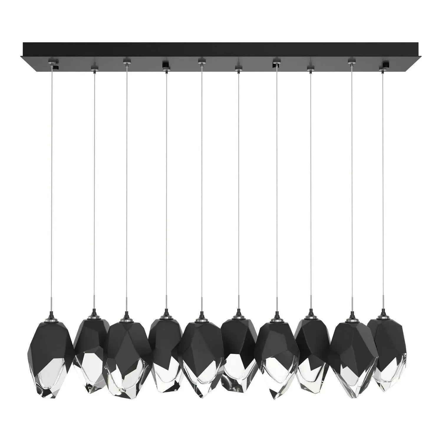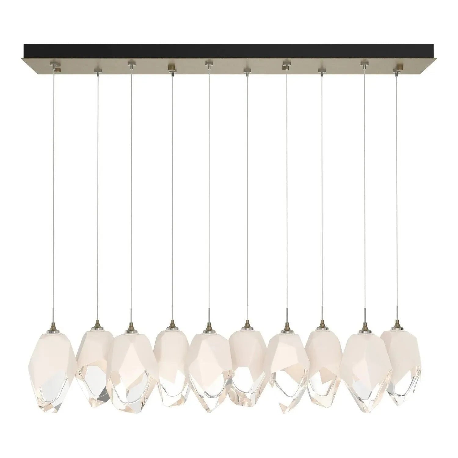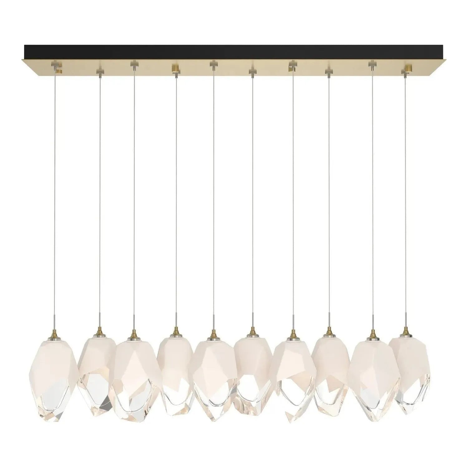 Ten Large Chrysalis pendants hung from a rectangular canopy. Each pendant may be individually adjusted for a custom look. Note, the upper canopy can will always be black while the canopy faceplate will match the selected finish.