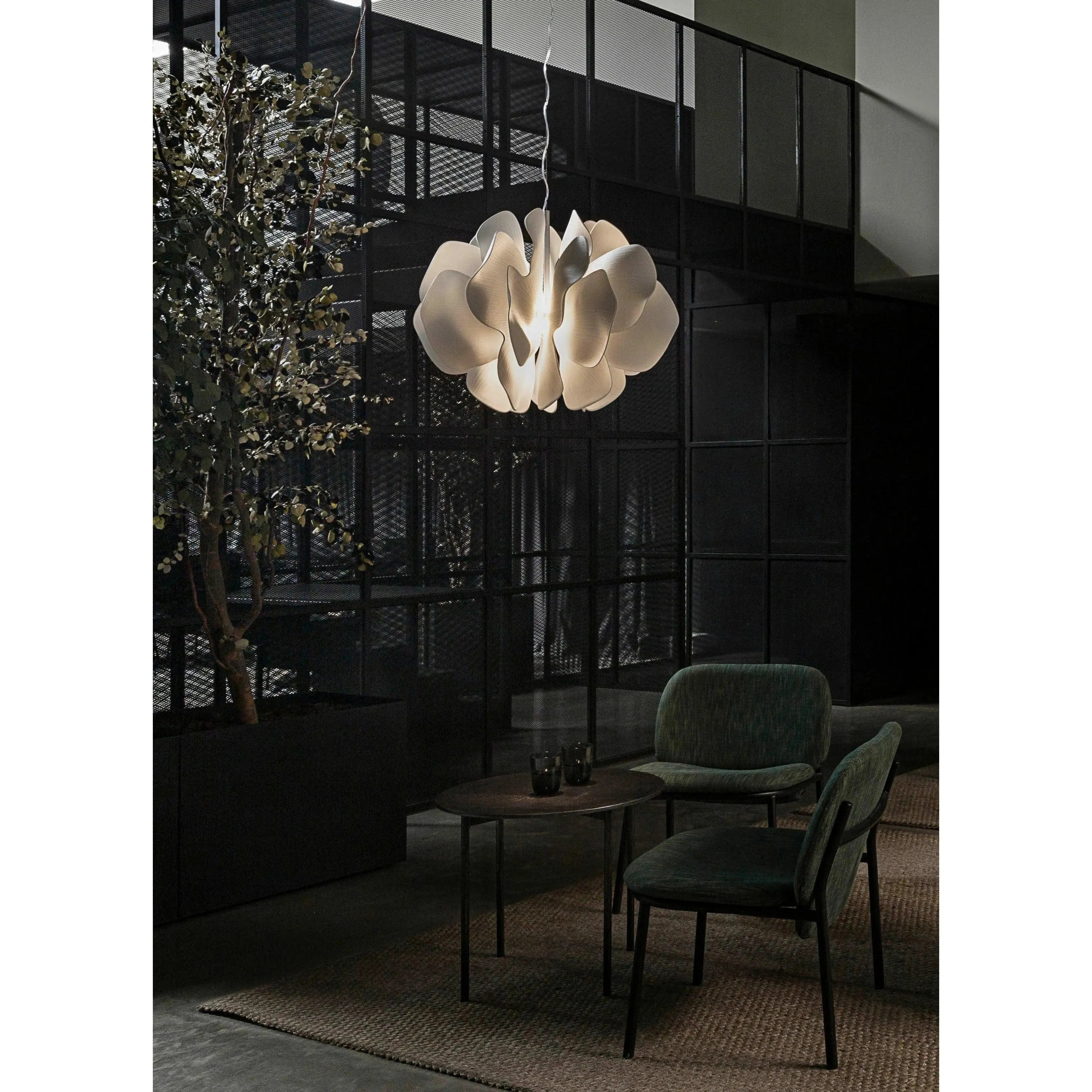 Porcelain hanging lamp with a spectacular design inspired by the petals of a flower delicately swaying in the breeze.