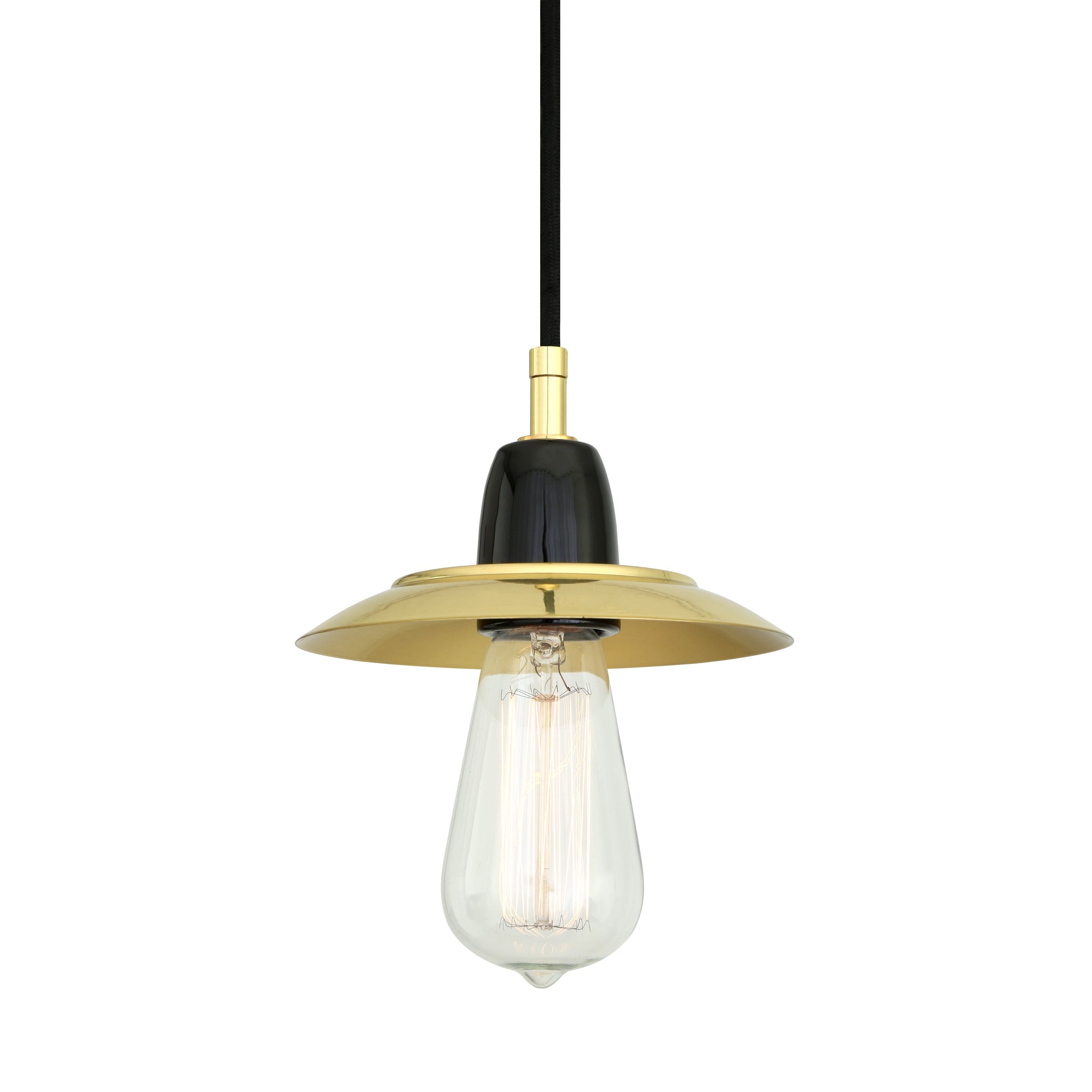 Design & materials: Polished brass reflector, high-gloss ceramic mounting, fabric-covered suspension cord and exposed lamp for controlled downlight and visible filament warmth—crafted for quality and longevity.