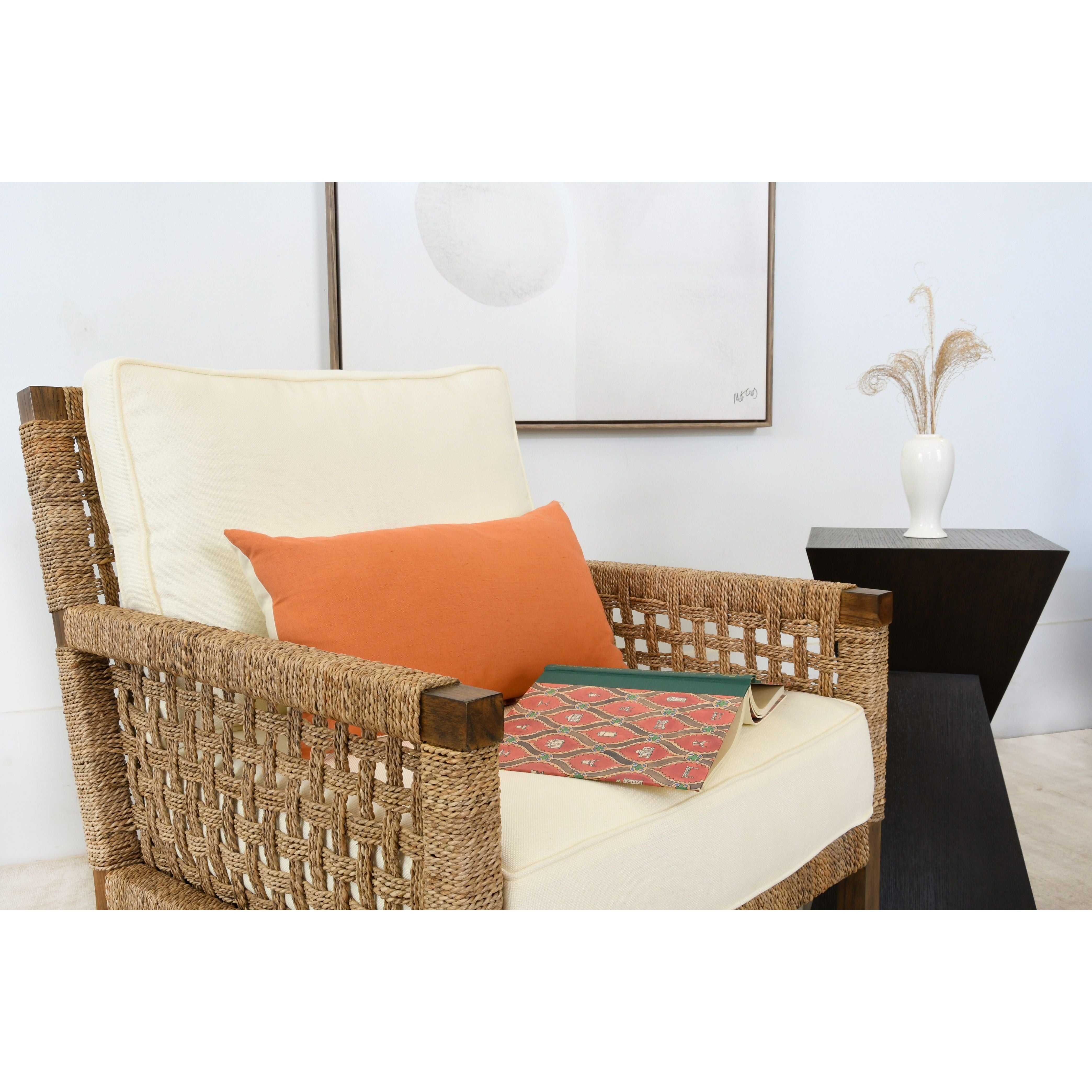 The Harmon club chair is destined to become your personal sanctuary. Its natural materials, from the mindi wood frame to the woven seagrass details and the sumptuous ivory linen cushion, come together to form a symphony of textures and fibers that evoke a sense of serenity and refinement. The removable feature of the stain resistant ivory linen cushions adds both practicality and versatility, allowing you to easily clean and maintain their pristine appearance. Sit back, relax, and soak in the comfort of the Harmon club chair.