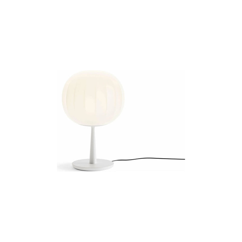 Frêne massif ou aluminium verni blanc, diffuseur en verre soufflé. |