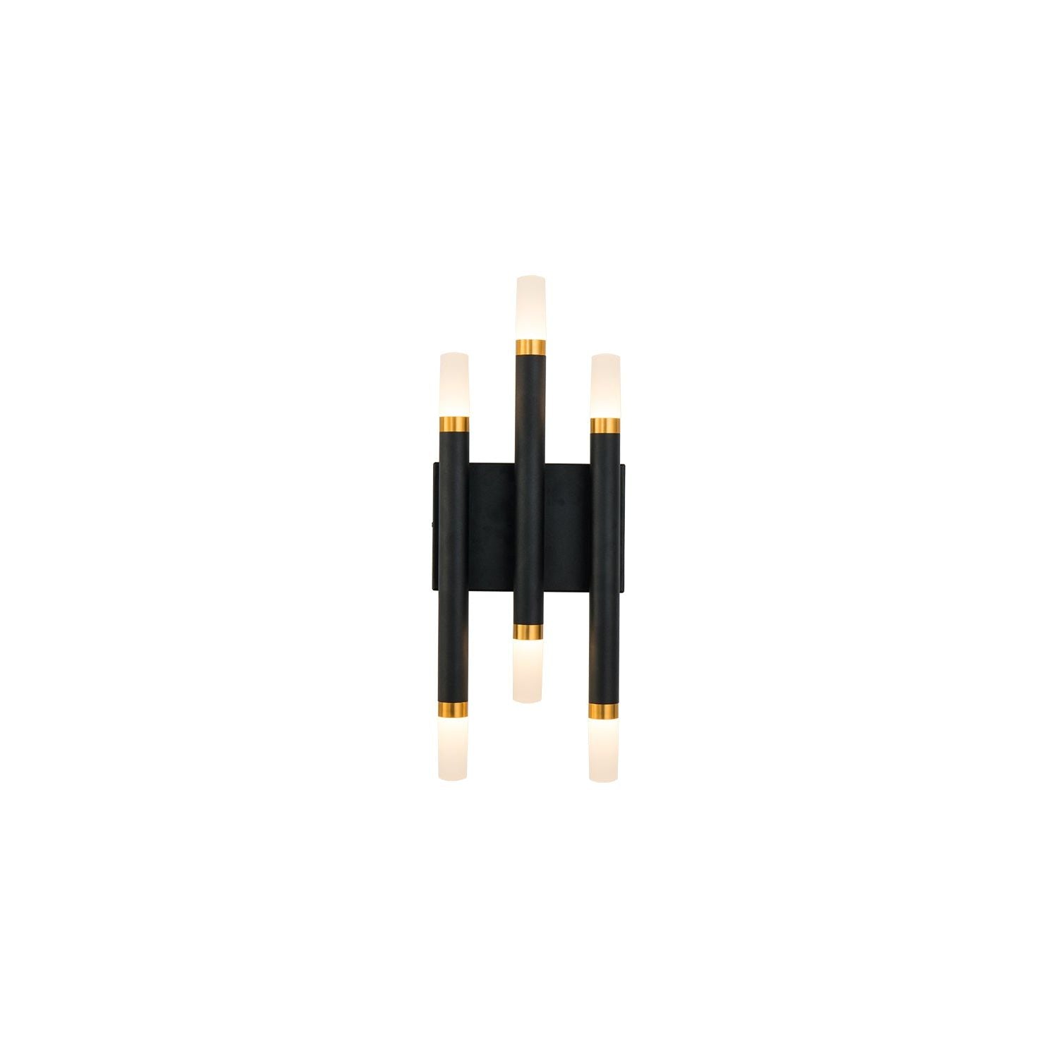 Bras cylindriques en aluminium s'étendant depuis un support mural carré. Finition thermolaquée finement texturée. Diffuseurs translucides ronds et effilés. Anneaux décoratifs plaqués or brossé. Éclairage vers le haut et vers le bas. Options personnalisées disponibles.