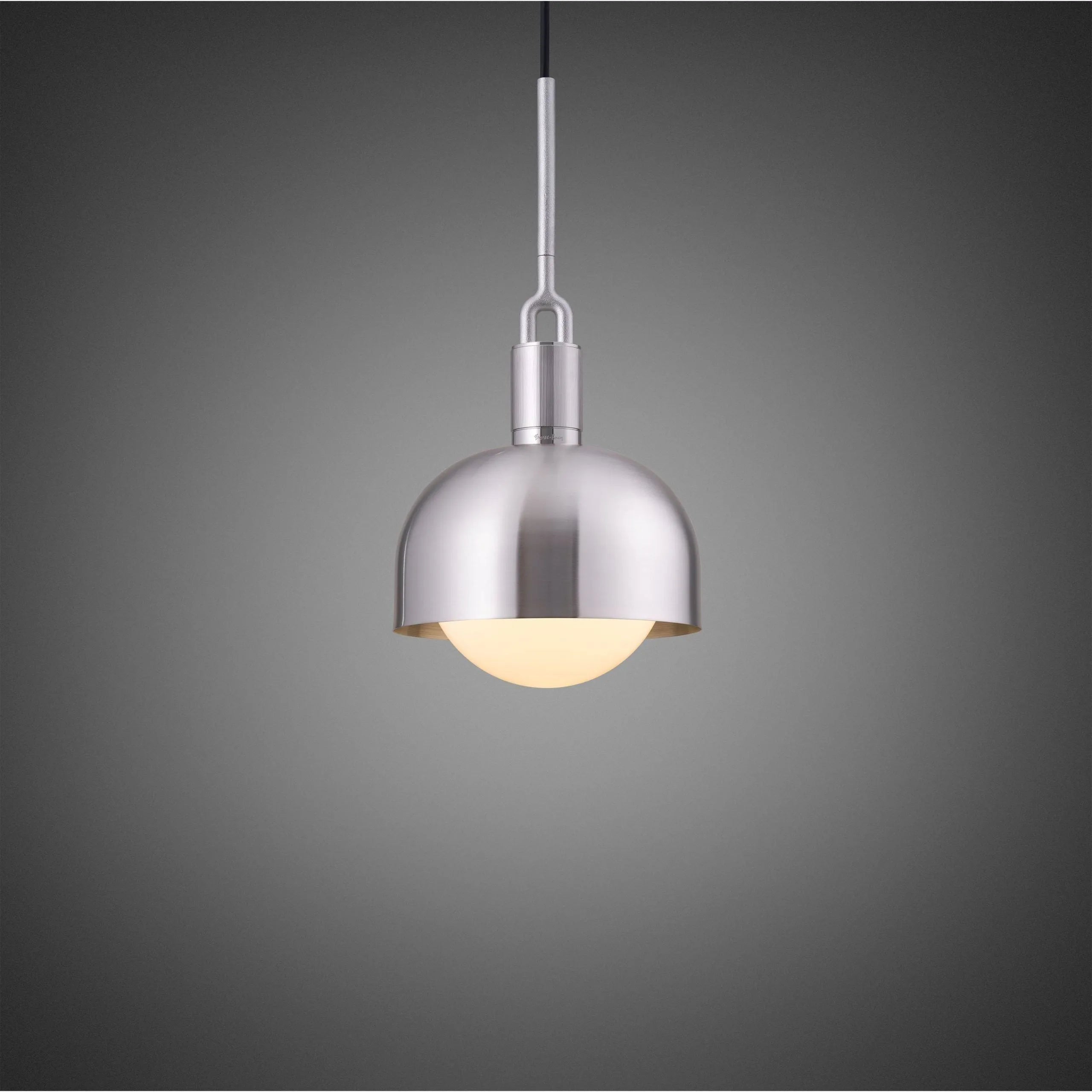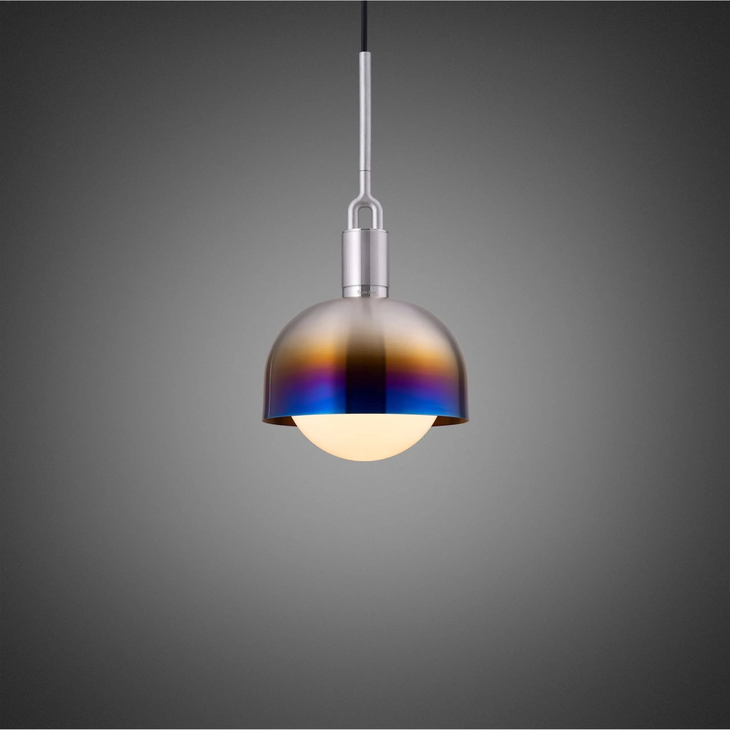 Une lumière Suspension et abat-jour, combinant métal usiné, filé à la main et coulé, le tout raffiné à la main. Il présente nos détails fourchus moulés et notre moletage linéaire à coupe diamantée emblématique. La lampe est livrée avec un globe en verre soufflé à la main et une ampoule Buster à intensité variable spécifique à Forked, projetant une lumière ambiante fonctionnelle dans cette configuration.