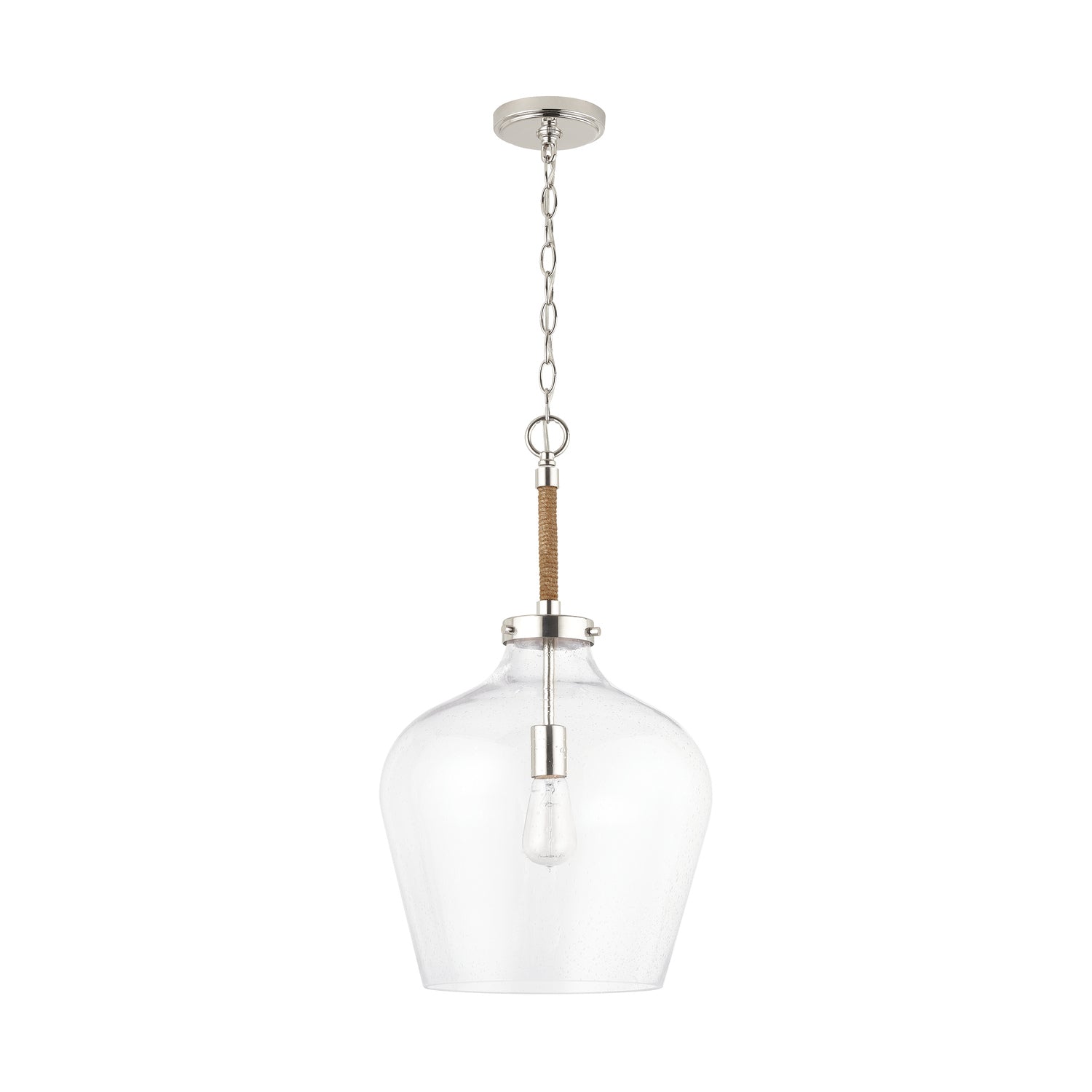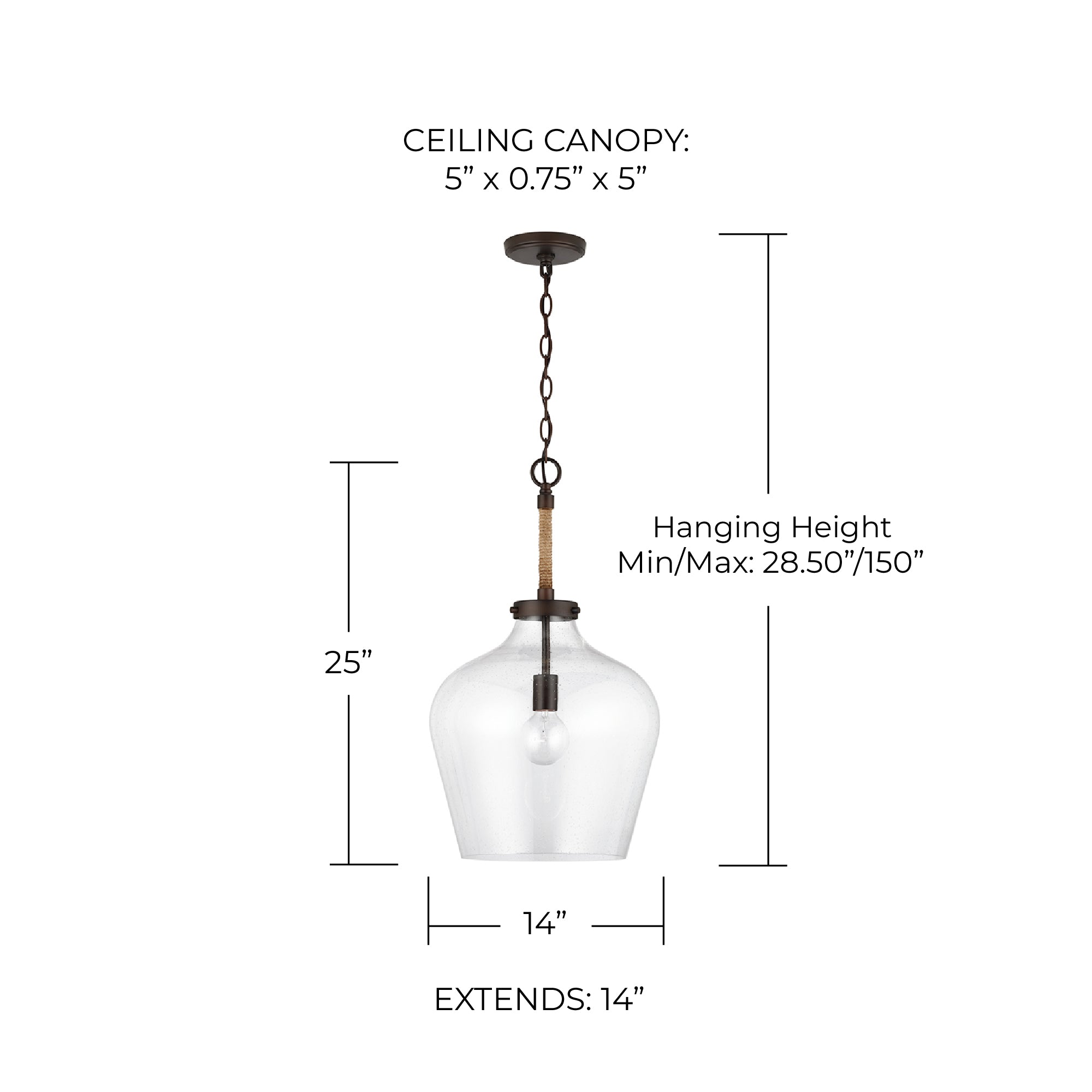 The seeded glass shade introduces understated texture, while the handwoven jute rope detail welcomes warmth and tactile interest to your ceiling scene.
