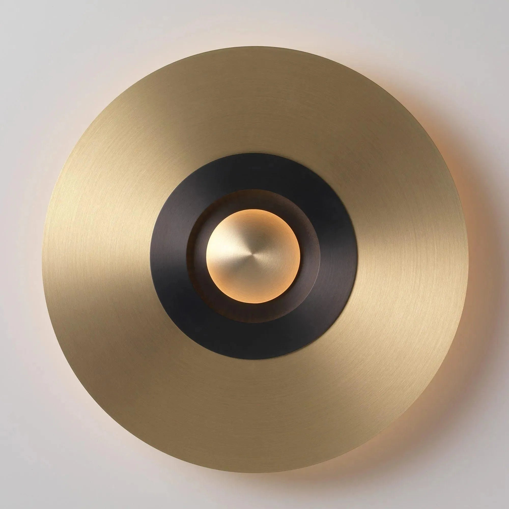 La Earth Sober Light d'inspiration Art déco comprend un disque central en graphite satiné ou en laiton satiné avec un motif découpé intérieur subtil et un disque extérieur en laiton satiné, cuivre satiné, graphite satiné ou nickel satiné. Disponible en deux tailles.