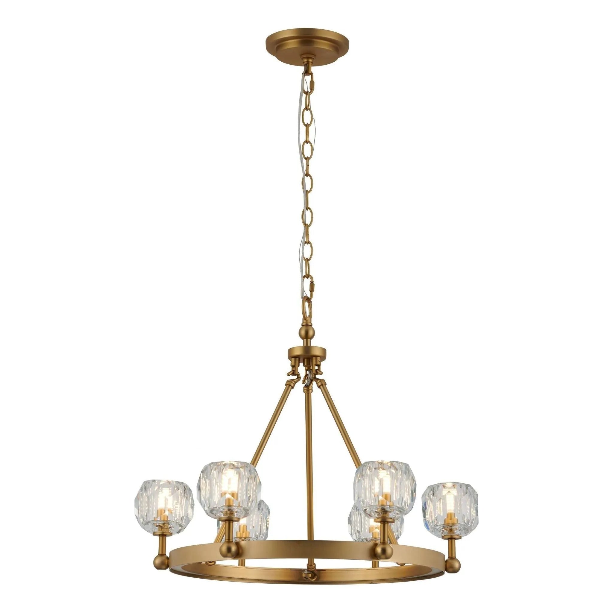Aluce 3606C Chandelier — a refined designer lighting statement that pairs a warm brushed-gold frame with six faceted glass shades to create luminous texture and sculptural balance. Its slim circular ring, tapered arms and suspended chain deliver a modern yet timeless silhouette tailored for dining rooms, foyers, or curated hospitality spaces.