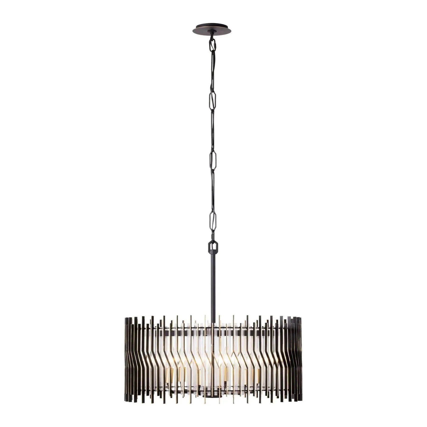 Inspirée par les éléments du pont de Brooklyn à New York, tels que représentés dans une illustration trouvée au Smithsonian American Art Museum, la collection Park Row est sûre de combler le fossé entre fonctionnalité et design inspiré. Les tours de pierre néo-gothiques du pont de Brooklyn soutiennent une conception hybride de pont à haubans / suspendu, avec des câbles de suspension verticaux et diagonaux, qui sont l'inspiration de Park Row. Les câbles entrelacés créent un motif répétitif que nous avons enroulé autour et supportent des tiges de verre recyclées cannelées transparentes modernes. La collection est forgée à la main à partir d'acier recyclé à 70 %. Fini à la main en noir mat avec des bords en or français.