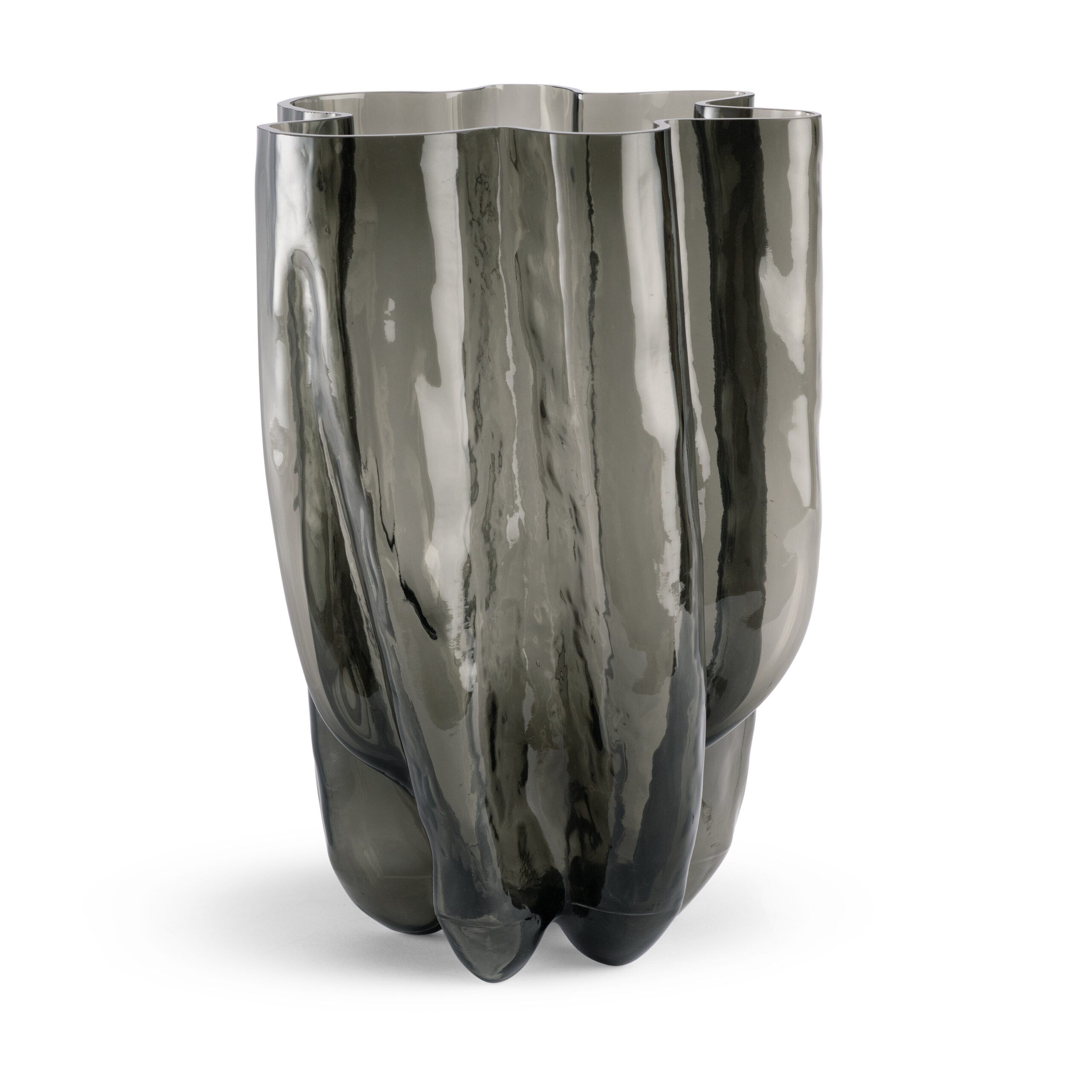 Le vase Hudson présente des reliefs profonds qui lui confèrent une apparence organique. Ses élégantes asymétries offrent une perspective différente selon l'angle de vue, faisant de cet accessoire un élément dynamique qui s'intègre à tous les décors. Ce vase en verre épais est étanche et peut accueillir des fleurs coupées.