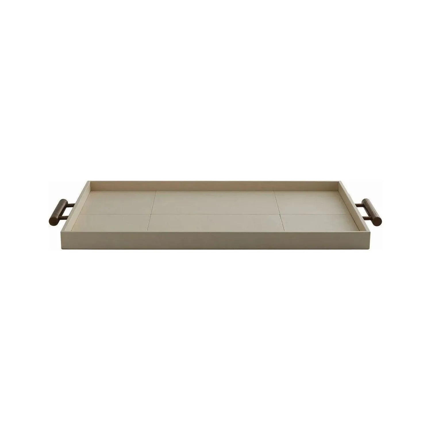 Géométrie élégante et matériaux raffinés donnent vie à ce plateau contemporain. Entièrement enveloppé de cuir ivoire souple avec des coutures sur mesure, il est magnifiquement conçu, ce qui ajoute à sa qualité et à son charme. Pour faciliter l'utilisation, les poignées en laiton reposent de chaque côté, chacune avec une finition vieillie classique. Le cuir variera.