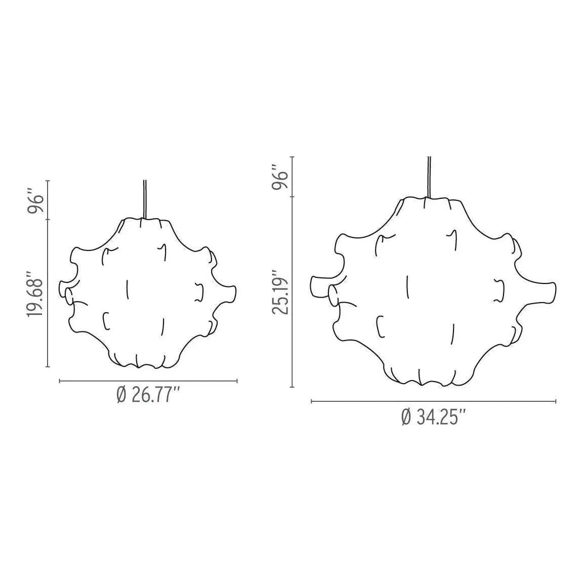 Le Taraxacum Suspension Doté d'une structure interne en acier à revêtement en poudre blanche pulvérisée avec une résine cocon unique pour créer le diffuseur qui est ensuite protégé par une finition transparente. Disponible en deux tailles. Une ampoule halogène à culot moyen de type T10 de 150 watts 120 volts est requise, mais non incluse. Petit : 26,77 pouces de largeur x 19,68 pouces de hauteur x 115,68 pouces de longueur de suspension maximale. Grand : 34,25 pouces de largeur x 25,19 pouces de hauteur x 121,19 pouces de longueur de suspension maximale. Homologué UL.