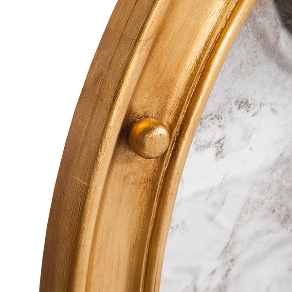 Notre grand miroir rond antique est l'élément essentiel de votre entrée ou de votre salle de bain. Son cadre de style fédéral est orné à la main d'une feuille d'or scintillante.