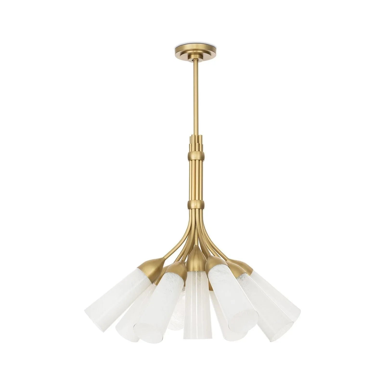 Un magnifique mélange d'art et de design inspiré par la forme délicate d'un bouquet en fleurs. Ses abat-jours en verre cannelé projettent une lueur radieuse, tandis que la structure en acier au fini laiton naturel ajoute une touche contemporaine. Suspendu est une pièce sculpturale qui allie sophistication, élégance et charme artistique.