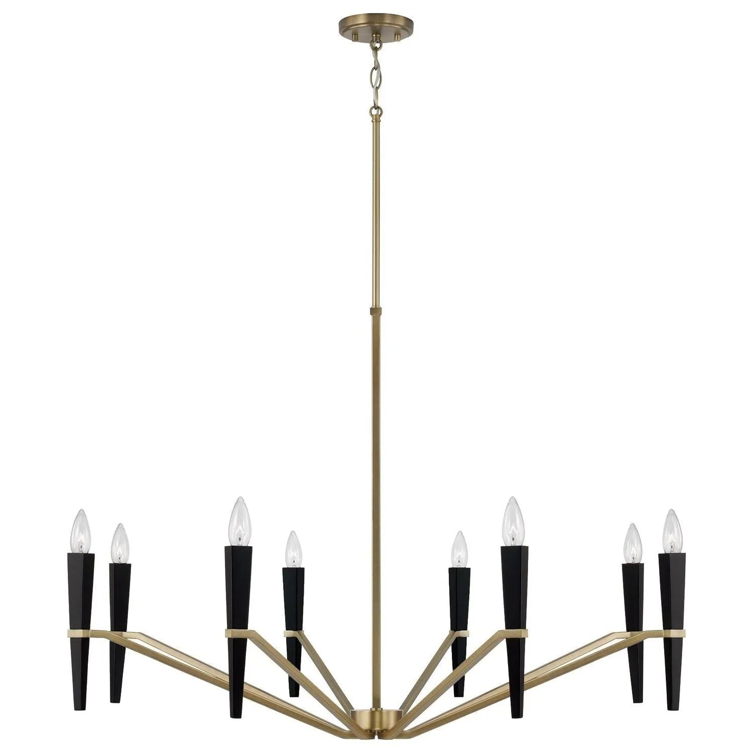 Apportez un style saisissant à n'importe quel espace avec l'Enzo Small Suspendu. Les manchons de bougie coniques et sculptés semblent percer les bras pour un design angulaire unique, tandis que les Laiton vieilli et la finition combinée noire crée une esthétique raffinée et moderne.