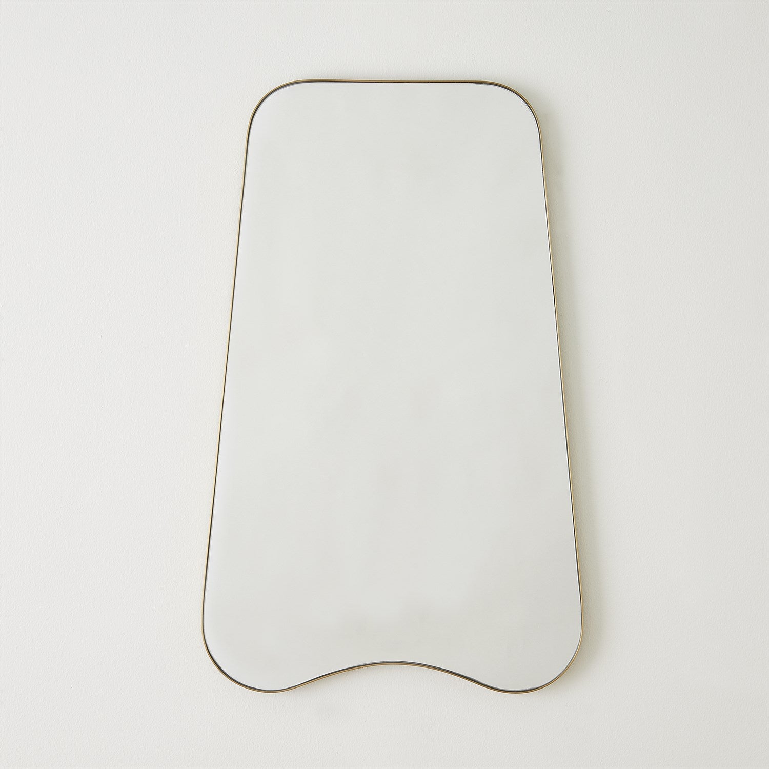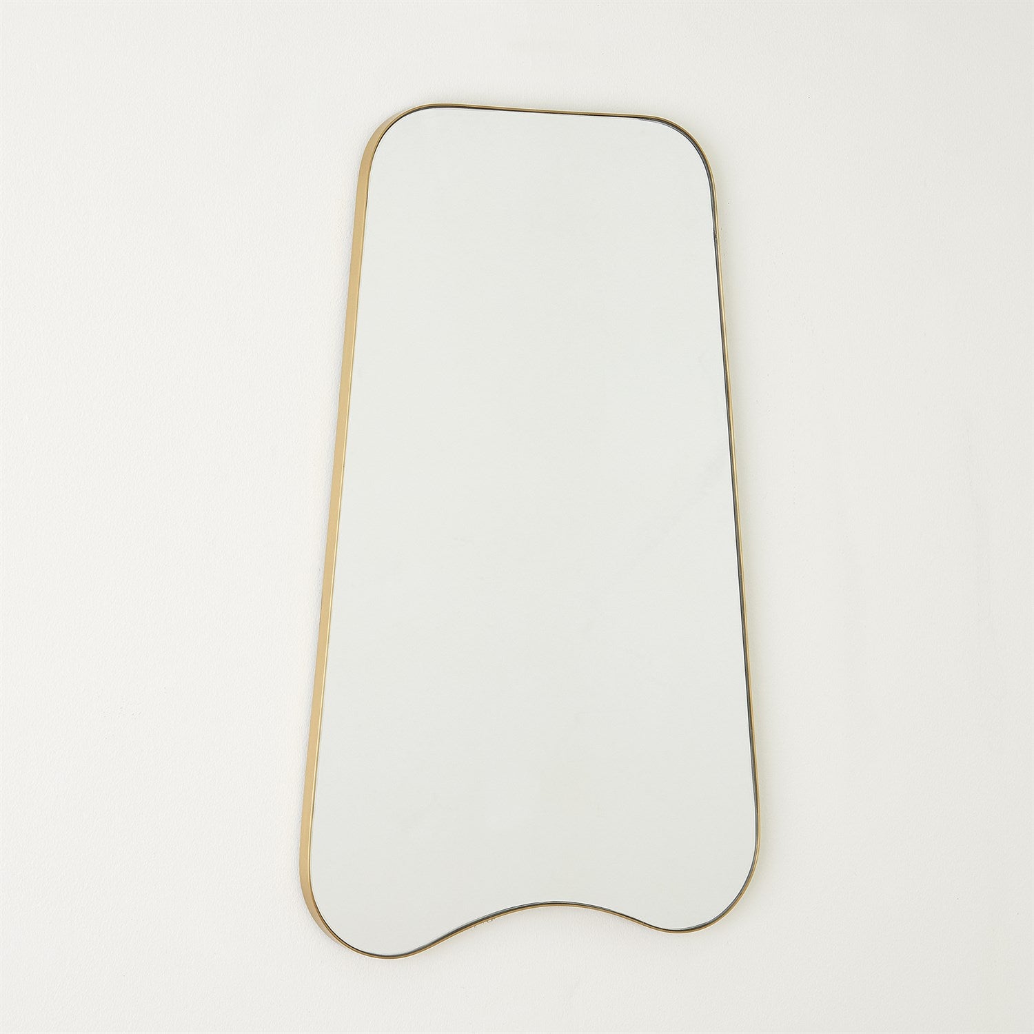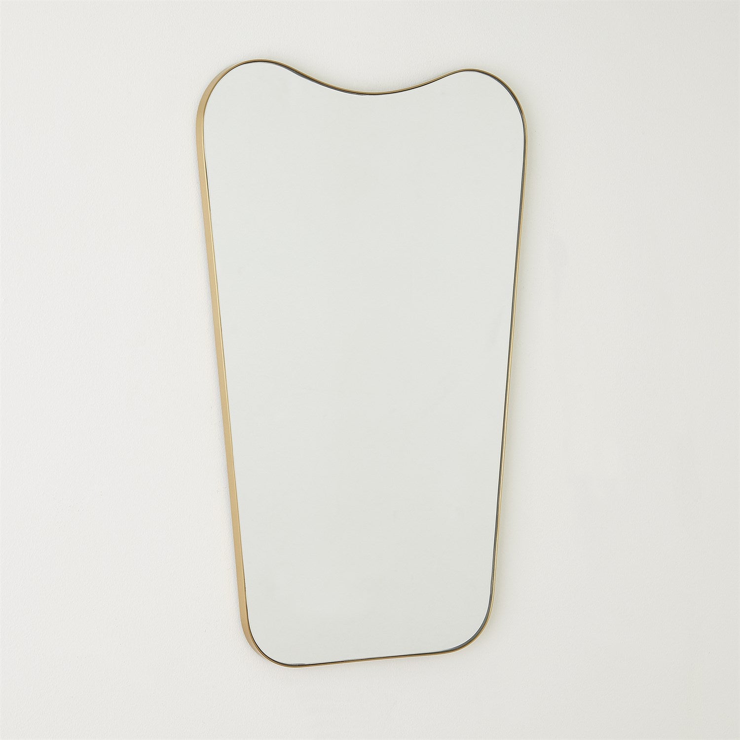 Le miroir à cadre organique présente un cadre légèrement incurvé en laiton brossé. Sa forme fluide et sa finition métallique chaleureuse reflètent subtilement la lumière, apportant une douce lueur à l'espace environnant.
