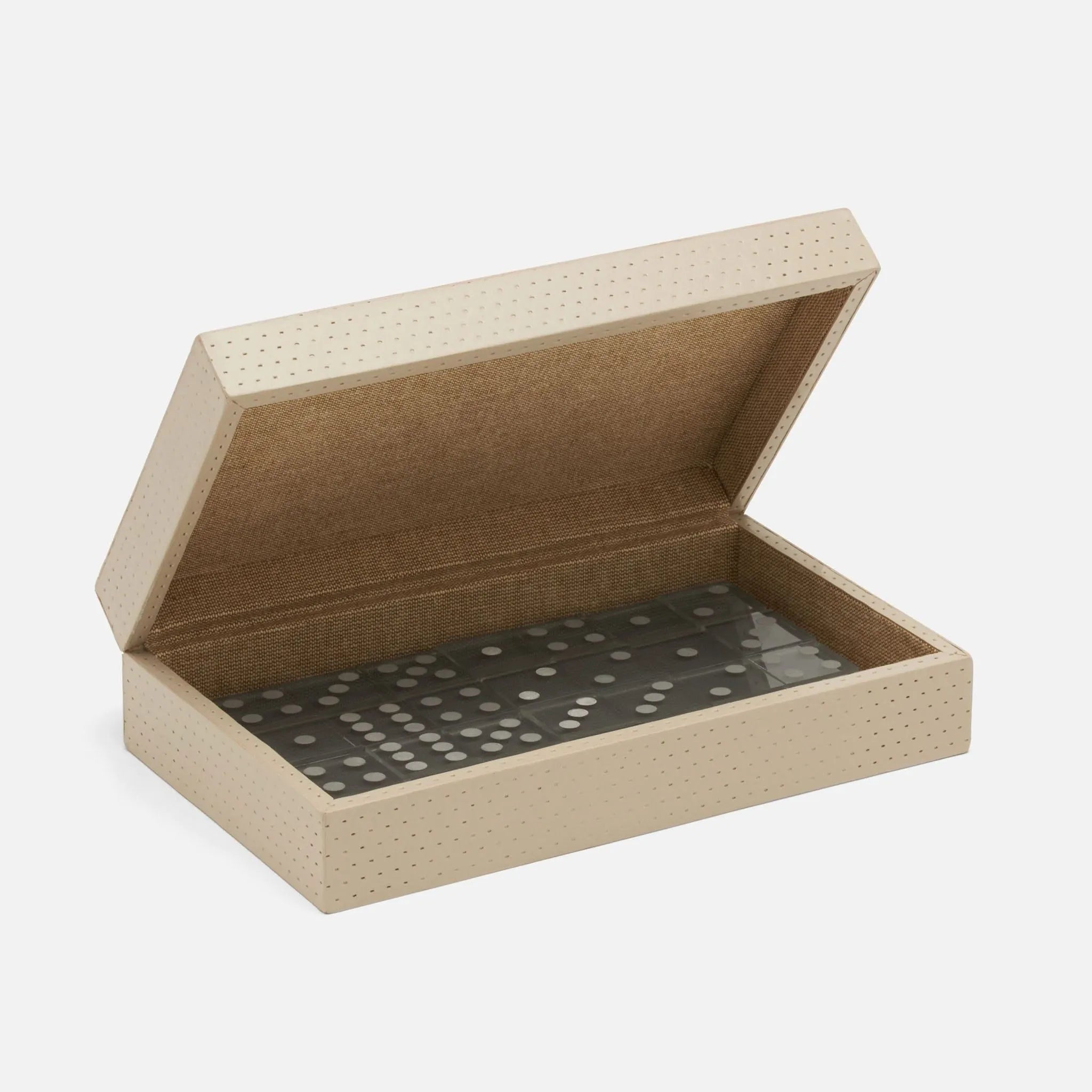 Jeu de dominos en cuir perforé pour inspirer le jeu pour toutes les générations. Disponible en taille standard et surdimensionnée.
