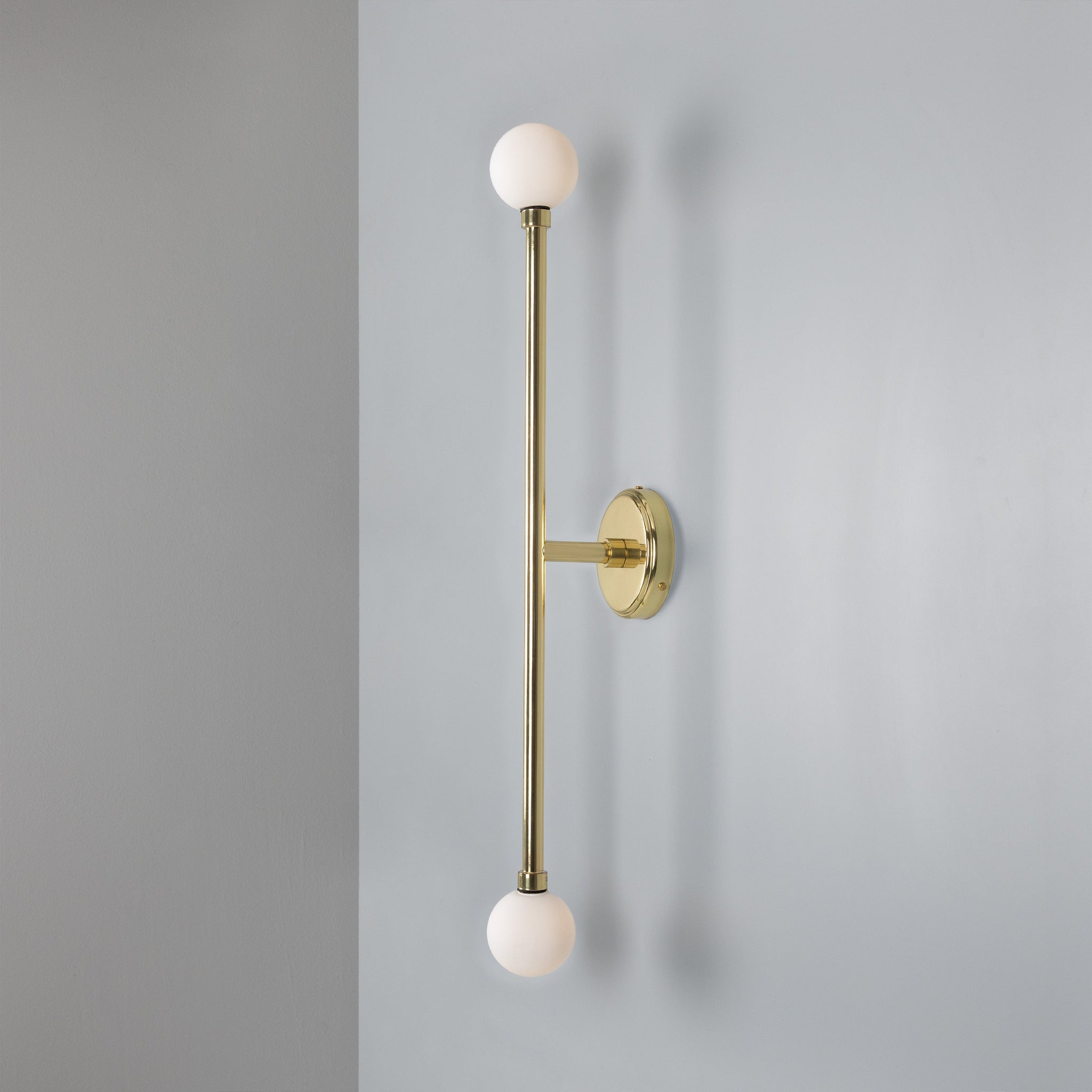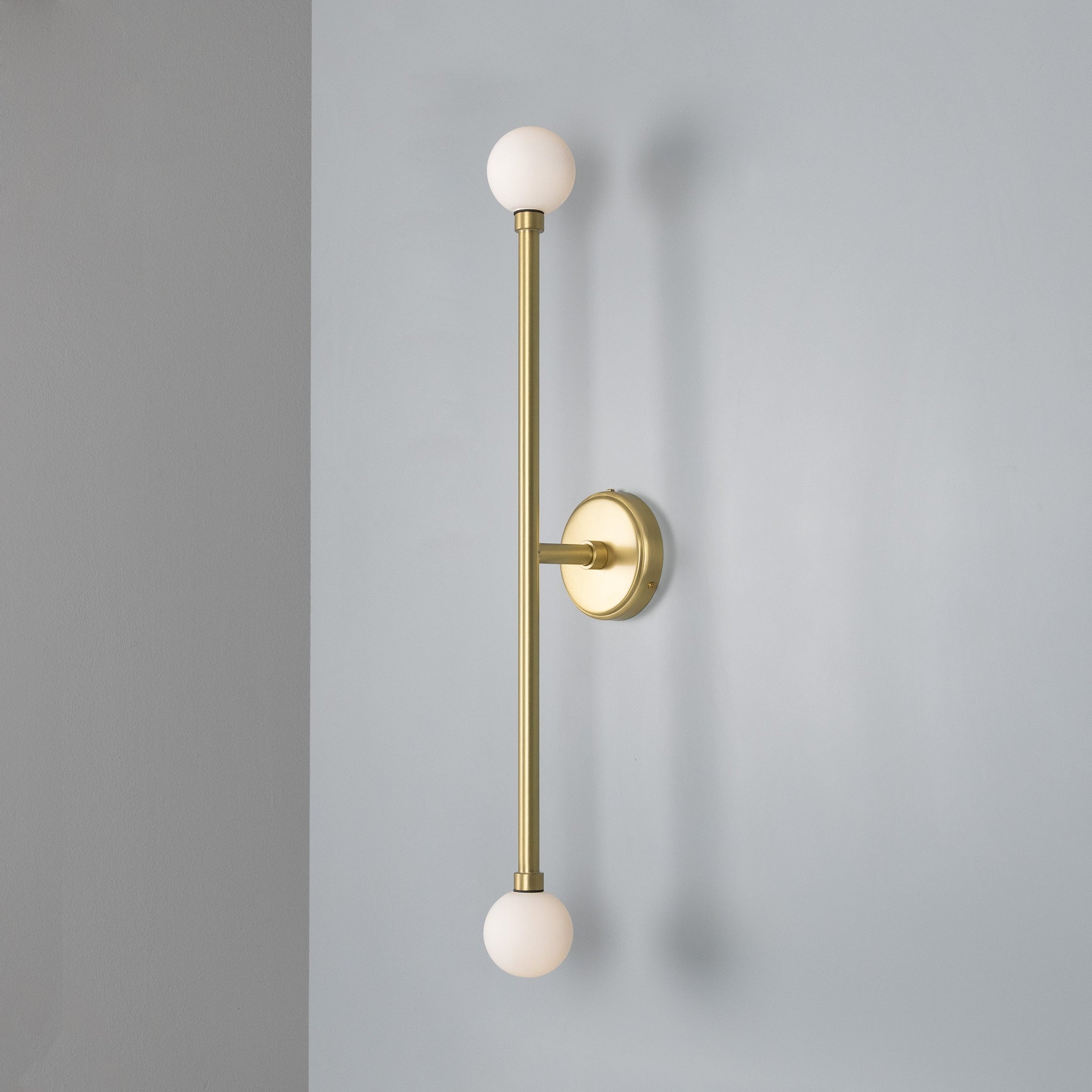 A minimal, vertically oriented wall sconce designed to balance sculptural form with practical performance. The Silverton Wall Light IP44 from Mullan Lighting pairs slender brass construction with two opal glass globes to deliver refined, glare-controlled illumination for bathrooms and damp spaces.