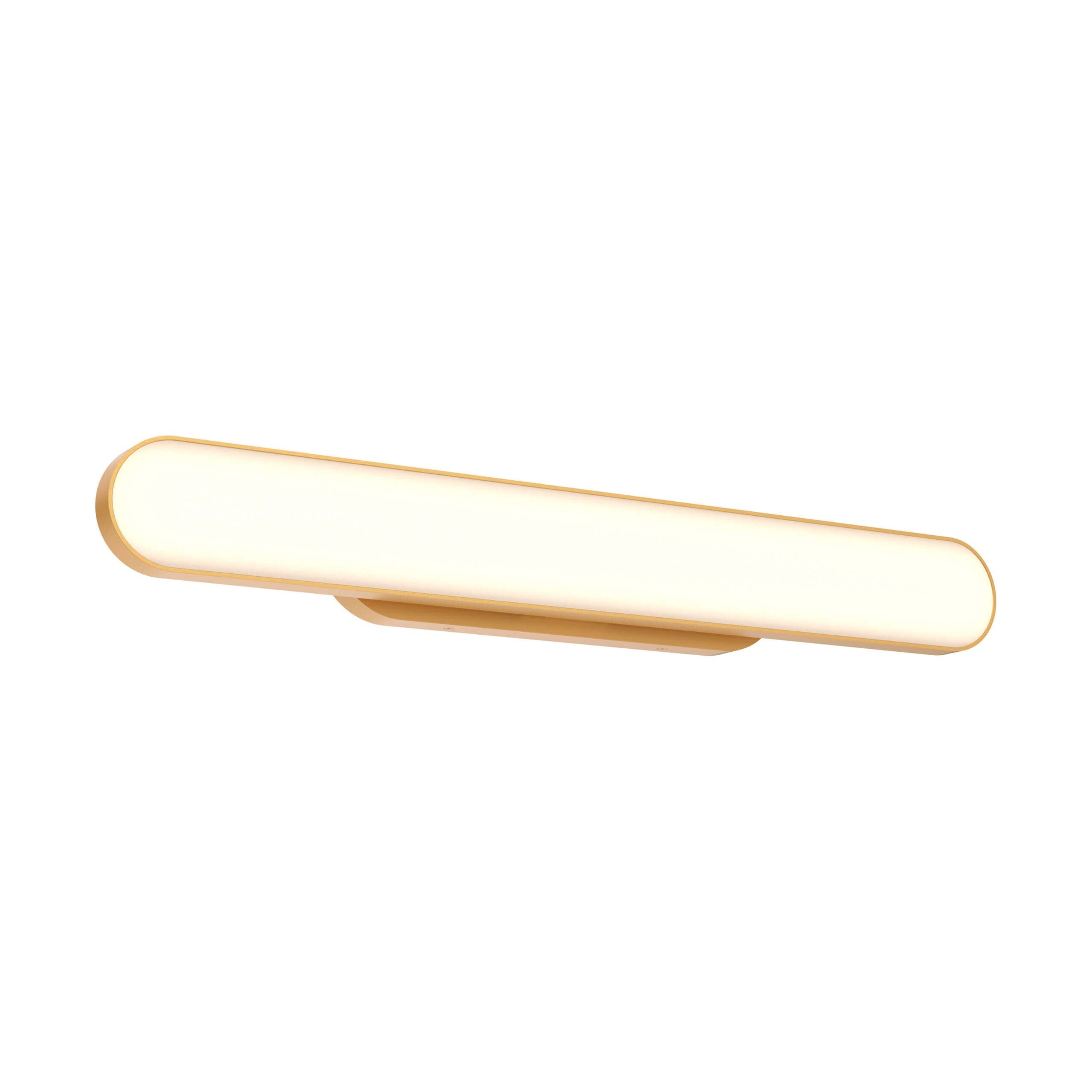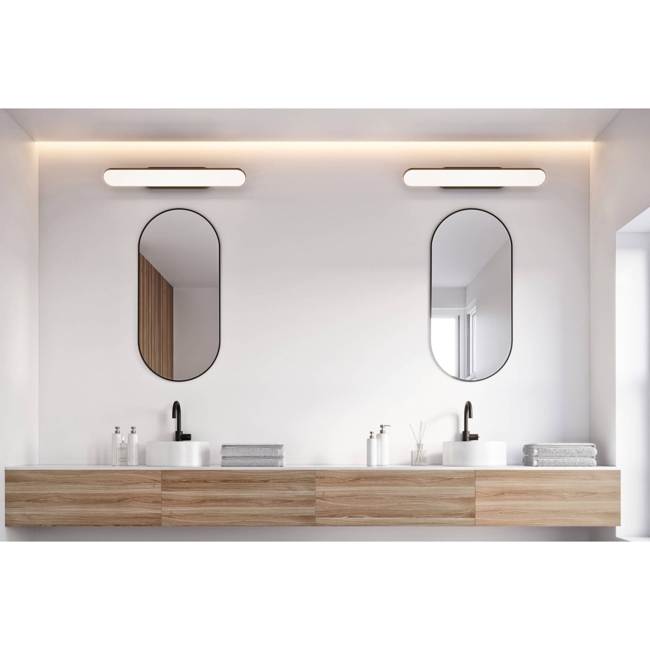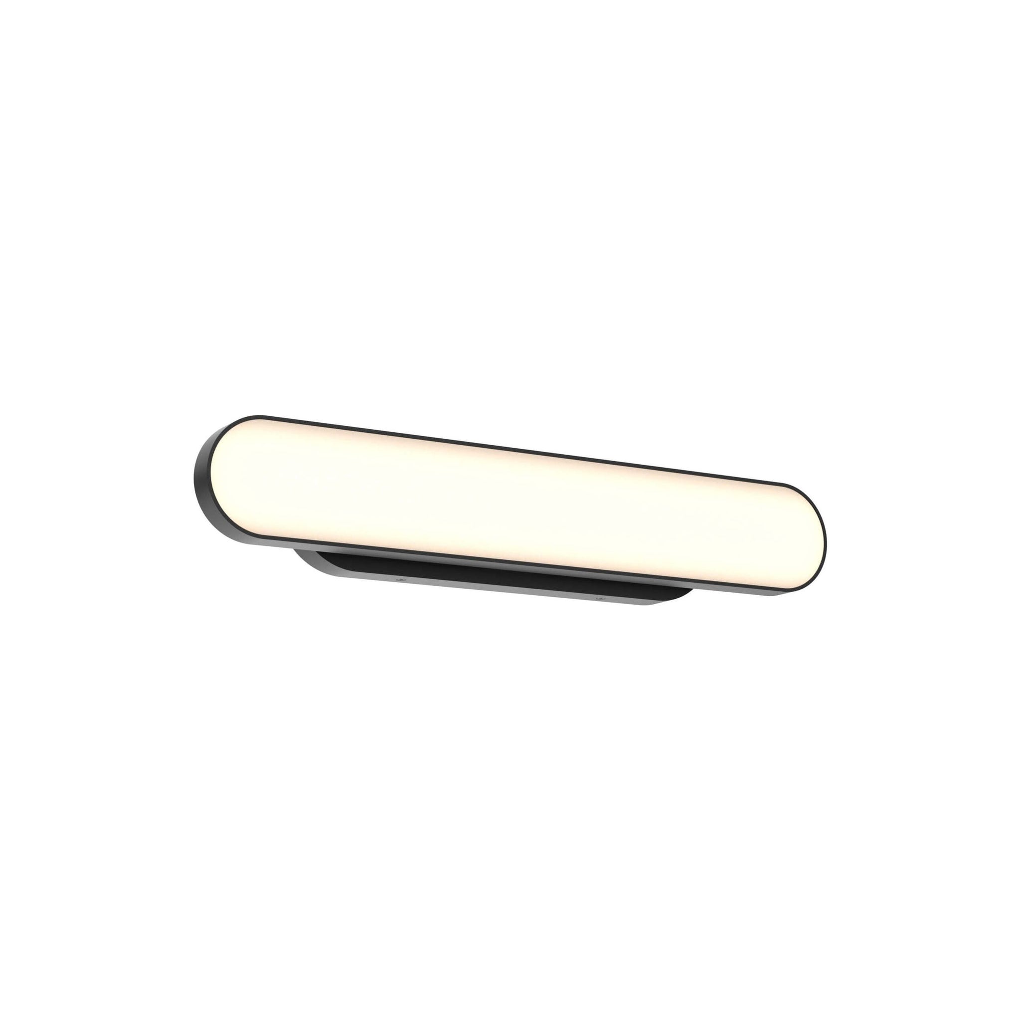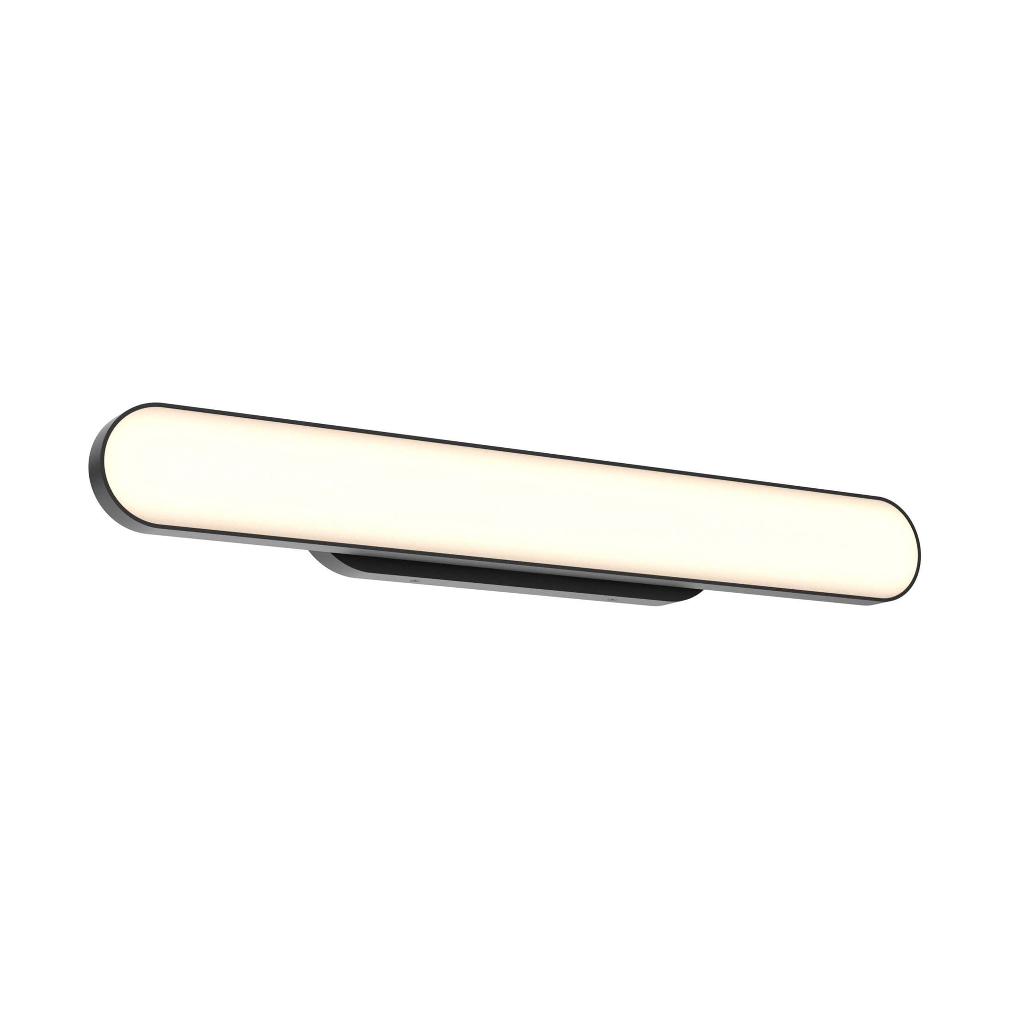 A sleek, high-quality LED profile luminaire with direct light output, crafted from durable aluminum extrusion. Its oblong linear head features an efficient 90° swiveling design for versatile lighting. The fixture can be offset from the electrical box by up to 5-1/2 inches to the left or right, making it easy to align with existing elements such as a sink or mirror.