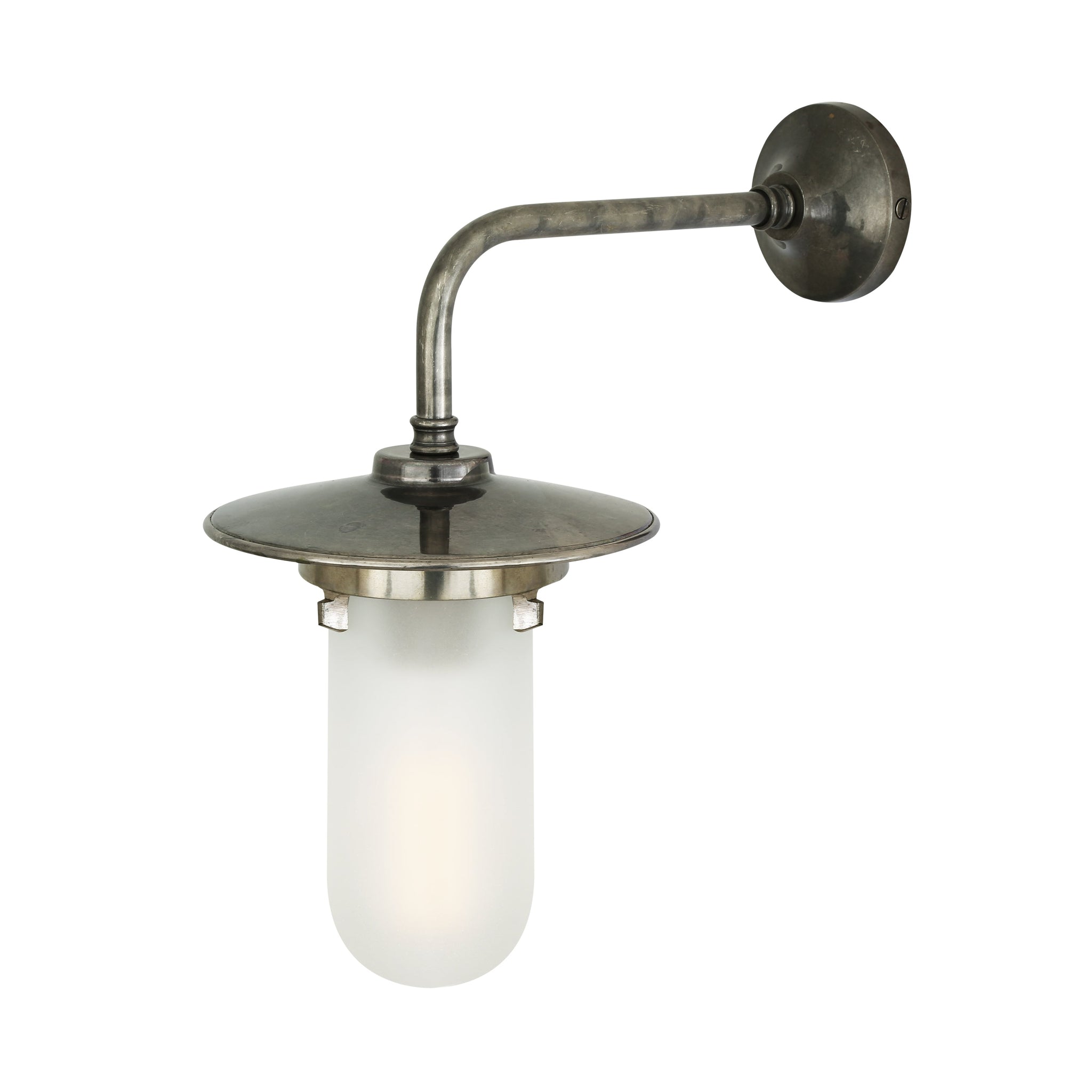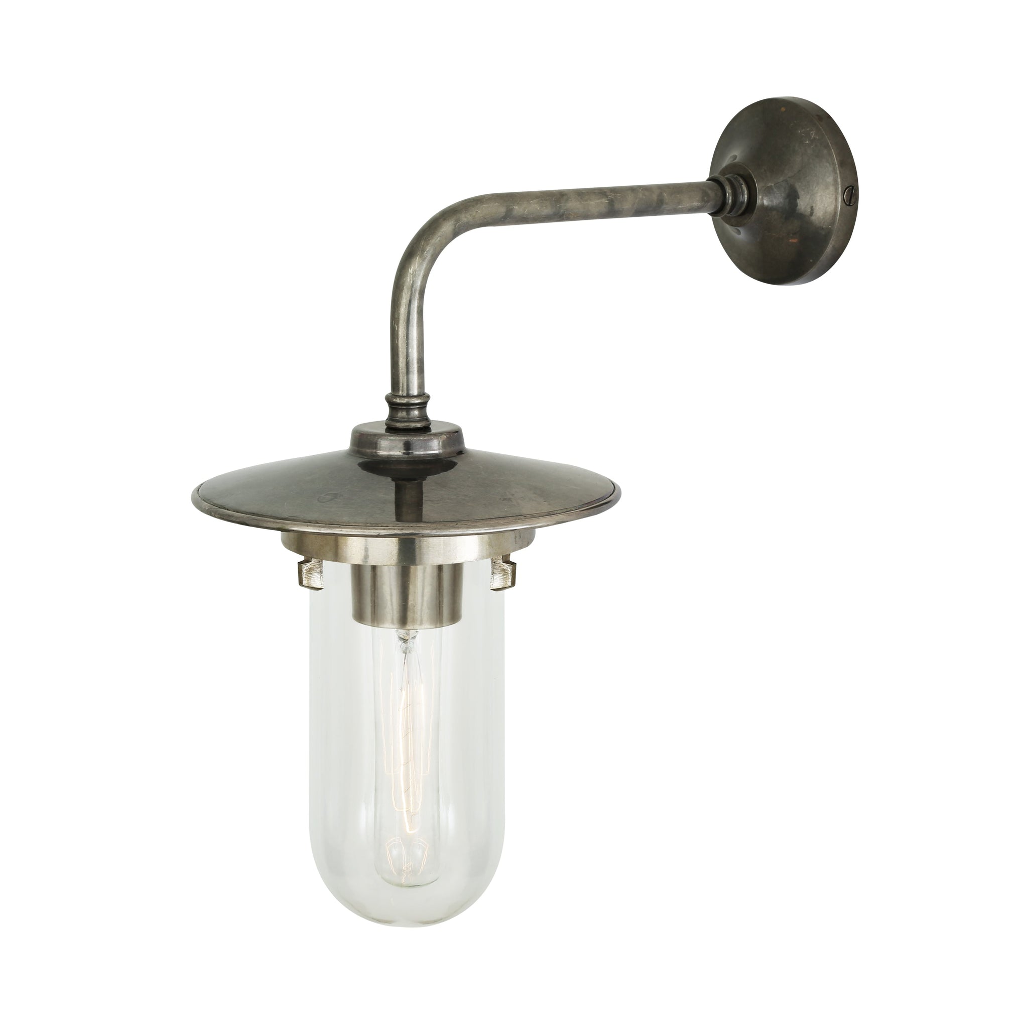 Florin Wall Light by Mullan Lighting pairs restrained industrial form with refined finish to deliver an immediately elegant designer lighting solution. A slender, curved arm suspends a low-profile metal shade over a clear tubular glass diffuser, exposing the bulb for intentional, directional illumination.