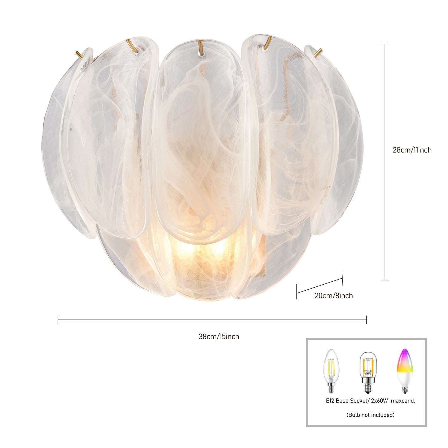 Bulbs: 2x B10 E12 60W, Dimmable