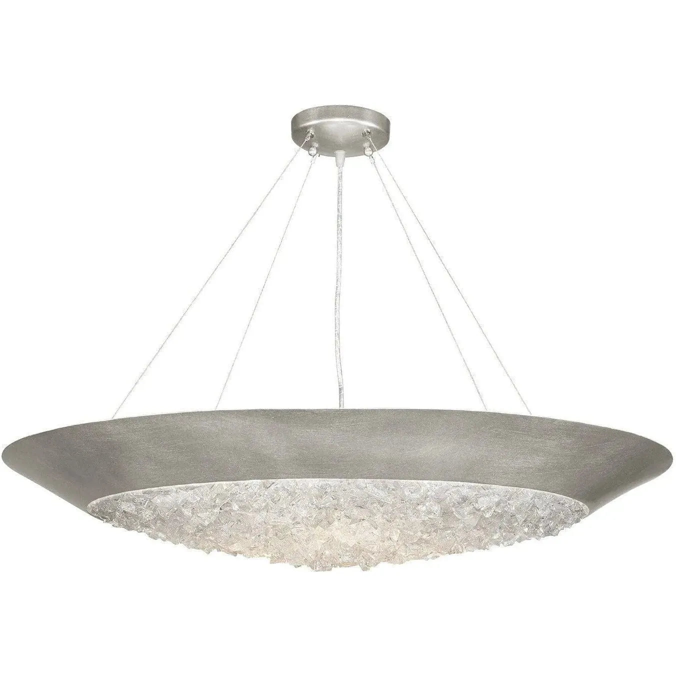 Suspendu dans une finition feuille d'or teintée champagne avec des centaines de pierres précieuses en verre de cristal brut qui réfractent la lumière d'une manière qui rappelle les cristaux de glace des cirrus qui forment le halo lunaire dans le ciel nocturne gelé. Également disponible en feuille d'argent platinée ou en noir mat.