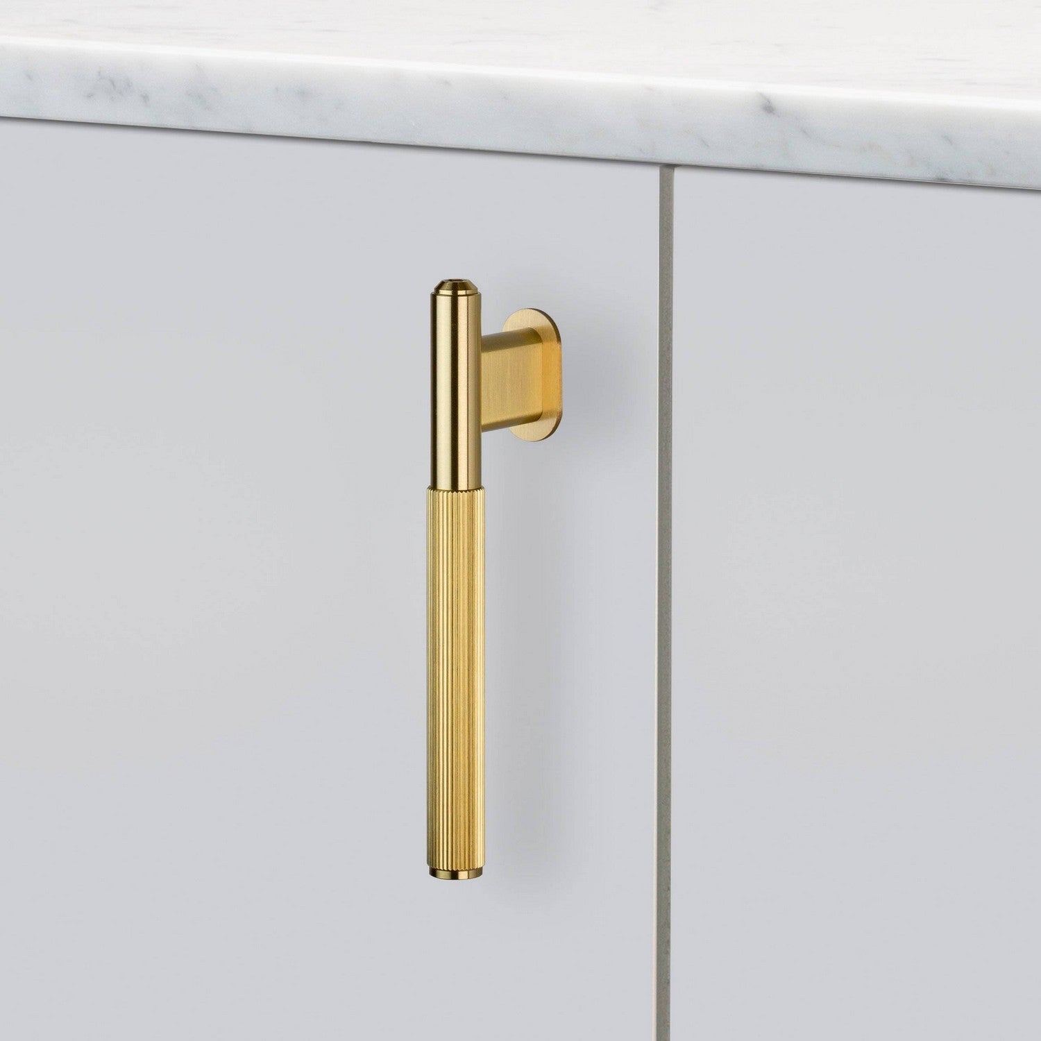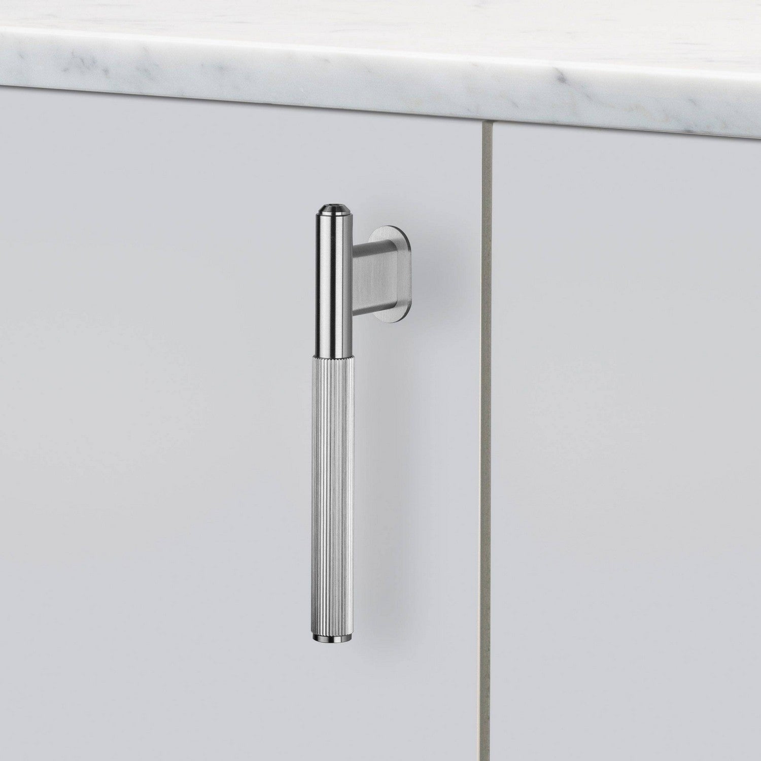 Une barre en L en métal anodisé noir. Cette barre en L présente notre motif exclusif de moletage linéaire à facettes diamantées, une tige ovale usinée avec précision et une finition artisanale. Elle est fournie avec un petit disque ovale en métal noir. Idéale pour les portes de placards, les armoires, les meubles de cuisine et pratiquement tout ce qui s'ouvre.