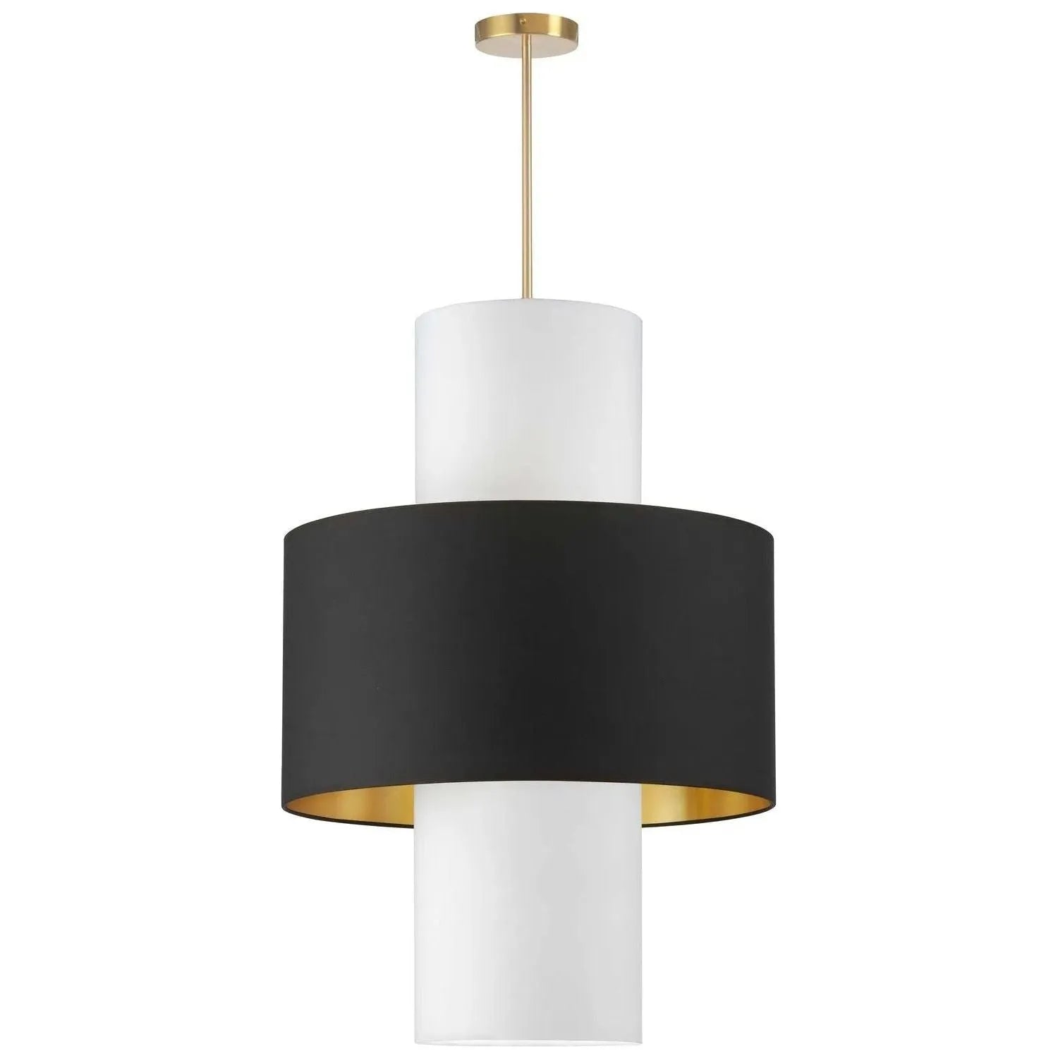 Patrona Pendant by Dainolite — a study in refined geometry and understated luxury. Two concentric cylindrical shades create a sculptural silhouette: a tall inner column encased by a wider outer drum with a warm gold-lined interior, suspended from a slim, polished stem and canopy.