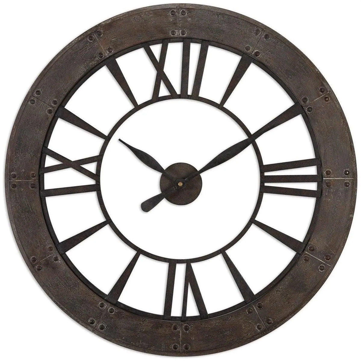 L'horloge murale présente une finition bronze foncé et rustique rehaussée d'un cadre gris rouille. Le mouvement à quartz assure un chronométrage précis. Nécessite une pile "AA".