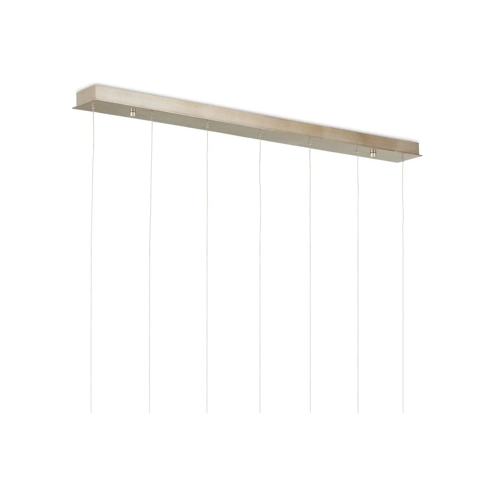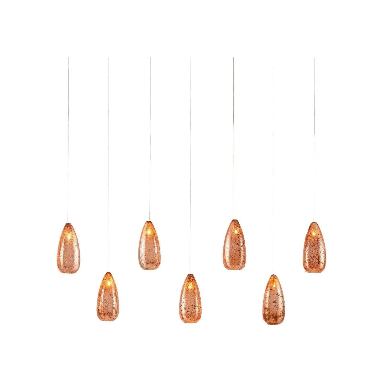 Suspension rectangulaire à 7 lumières Rame Suspension possède des abat-jours en forme de larme en verre au mercure avec de l'argent à l'intérieur et du cuivre à l'extérieur. La personnalité des motifs sur le verre est évidente que les lumières soient allumées ou non, mais lorsque l'éclairage illumine les abat-jours, l'effet est éblouissant. Le baldaquin de cette pièce est lumineux dans une finition argentée peinte. Ce luminaire fait partie des luminaires multi-gouttes de Currey & Company Suspension collection, qui comprend plusieurs configurations.