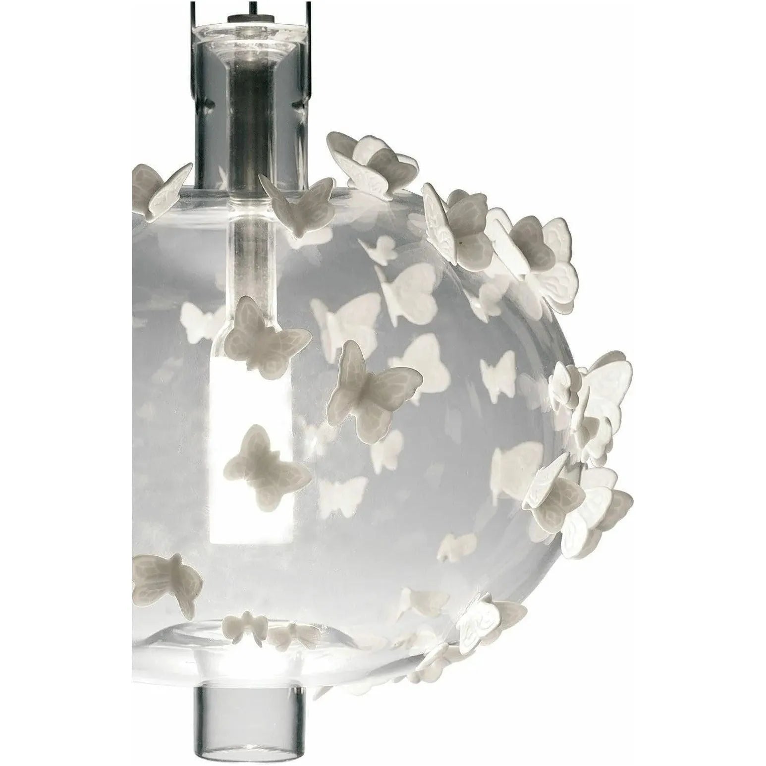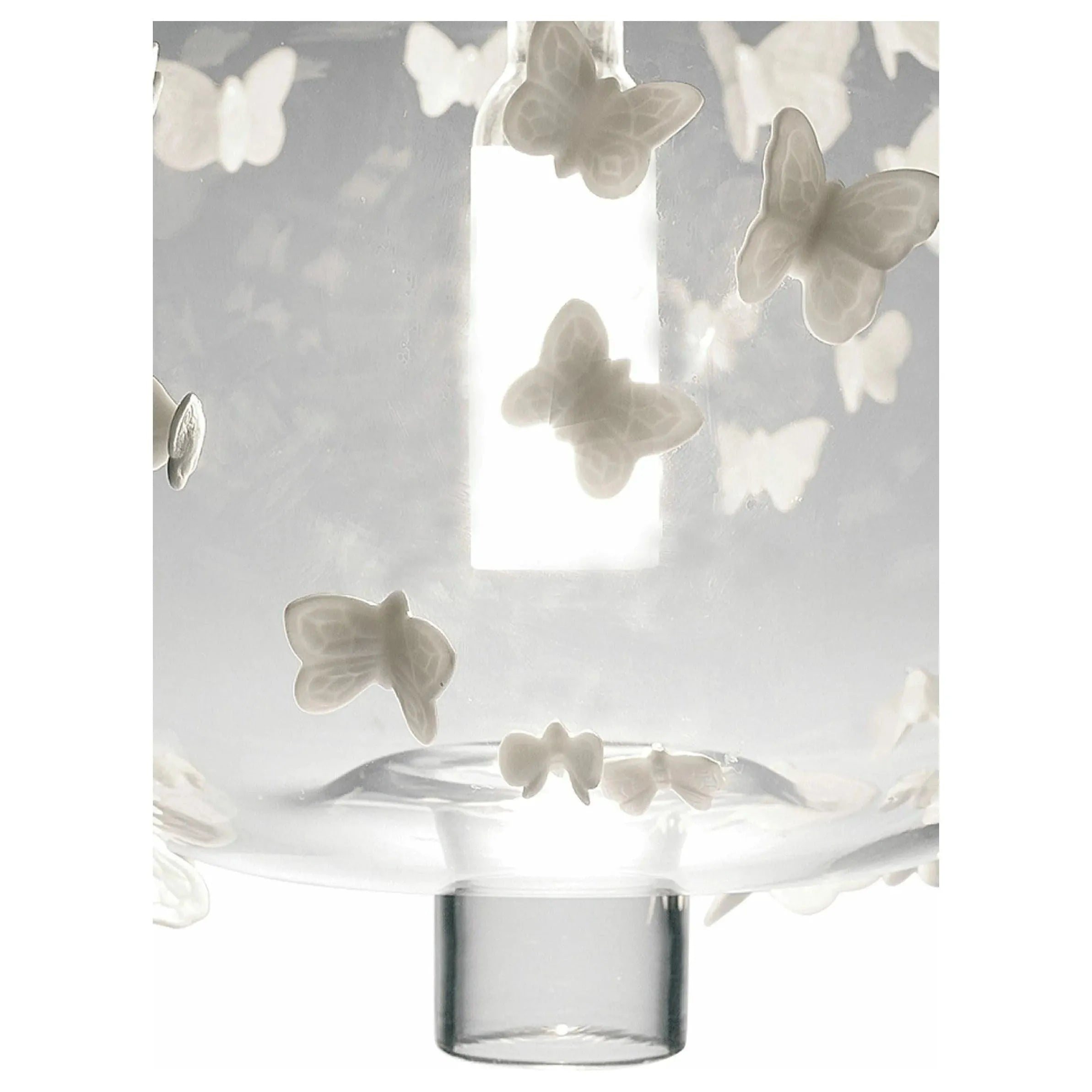 Plafonnier suspendu en verre soufflé avec des applications de papillons en porcelaine faites à la main.