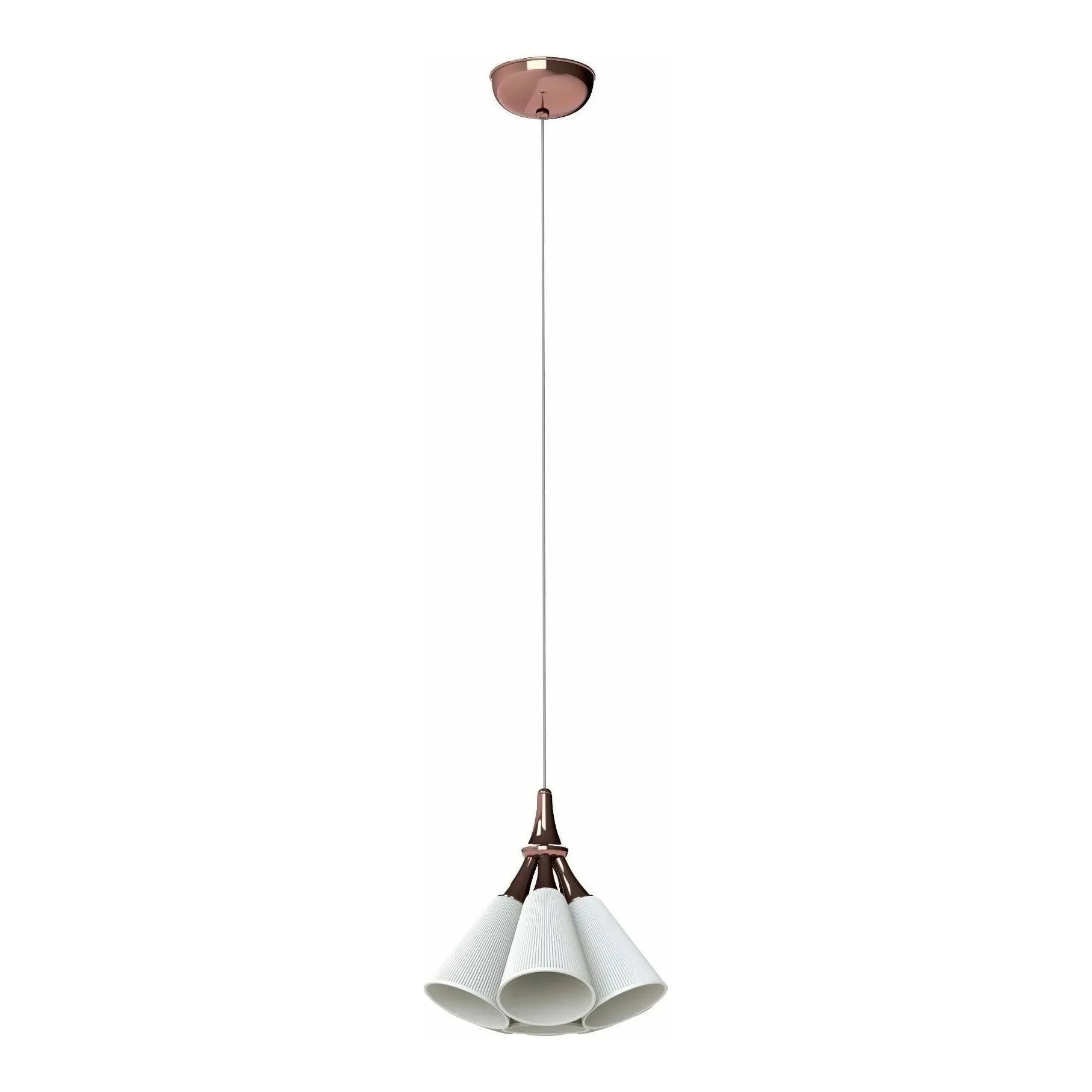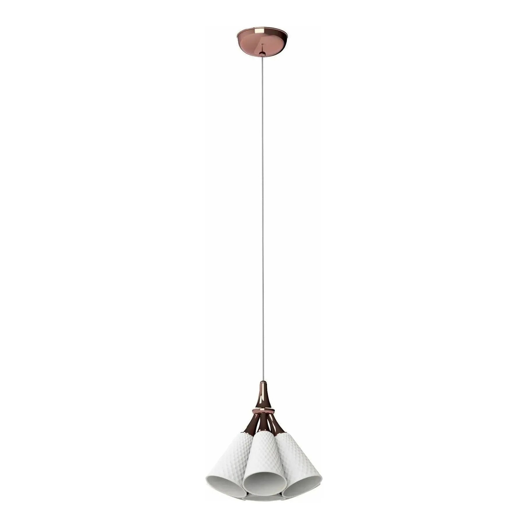 Plafonnier suspendu en porcelaine blanche translucide avec métal cuivré. Son design rappelle la forme des instruments de Jazz.