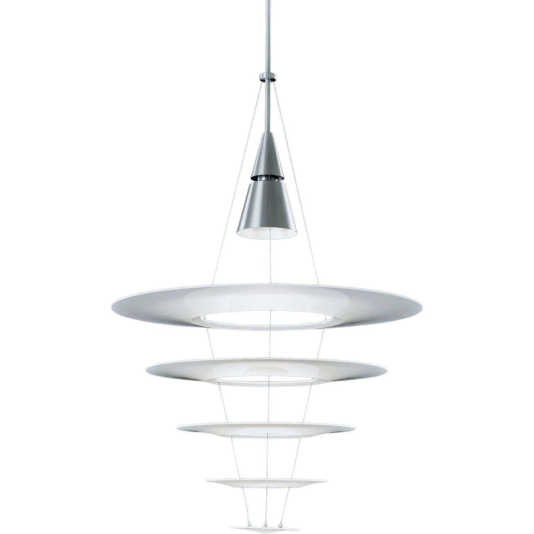 Enigma 545 a été conçu par le designer japonais Shoichi Uchiyama en 2007 et étend la famille Enigma. Enigma 545 est une version plus grande d'Enigma 425, basée sur l'idée de conception de nuances flottantes maintenues par des fils ultrafins, offrant une expression transparente et légère. Le nom énigme signifie « mystère », en référence au fait que les abat-jour semblent planer lorsqu'ils sont vus illuminés à distance. Le design correspondait bien à la philosophie du produit de Louis Poulsen et était une nouvelle interprétation du système multi-teintes - la grâce japonaise combinée à la simplicité scandinave. En 2018, la version originale en aluminium est rejointe par une nouvelle édition noire, élargissant les possibilités décoratives du design et créant un effet visuel et atmosphérique serein en façonnant et en canalisant la lumière.