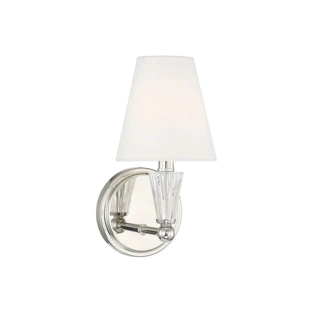 Meridian Wall Sconce by Meridian Lite Trends elevates interiors with a poised balance of refined form and functional light. A brushed‑nickel round backplate and a single sculpted arm support a fluted clear-glass detail that catches and refracts light beneath a clean, tapered white fabric shade—modern hardware crafted with classic sensibility.