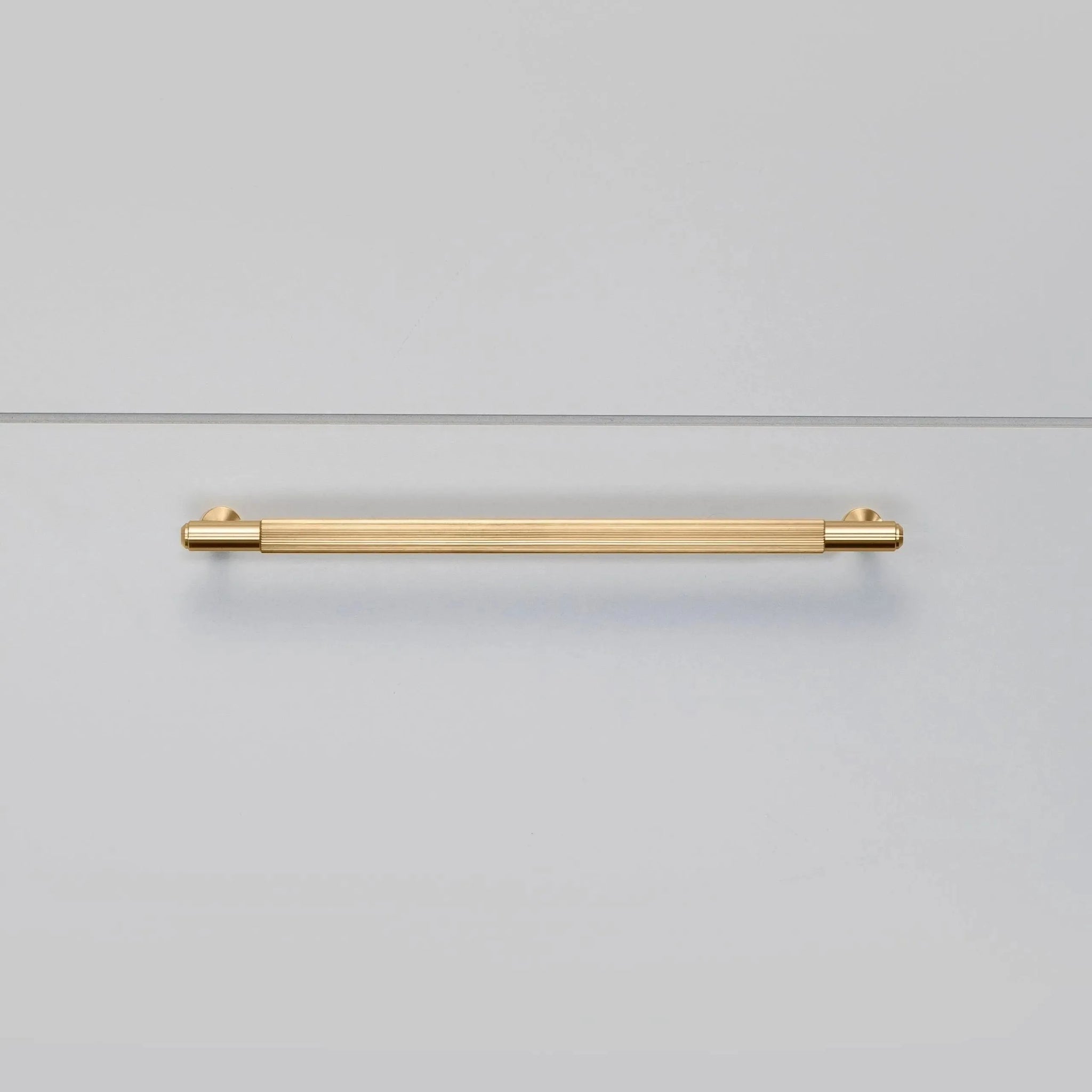 Une barre de traction en laiton massif. Cette barre de traction présente notre motif moleté linéaire emblématique, taillé en diamant, et est raffinée à la main. La barre de traction comprend une plaque arrière rectangulaire en laiton massif et finie avec des vis Torx en laiton.