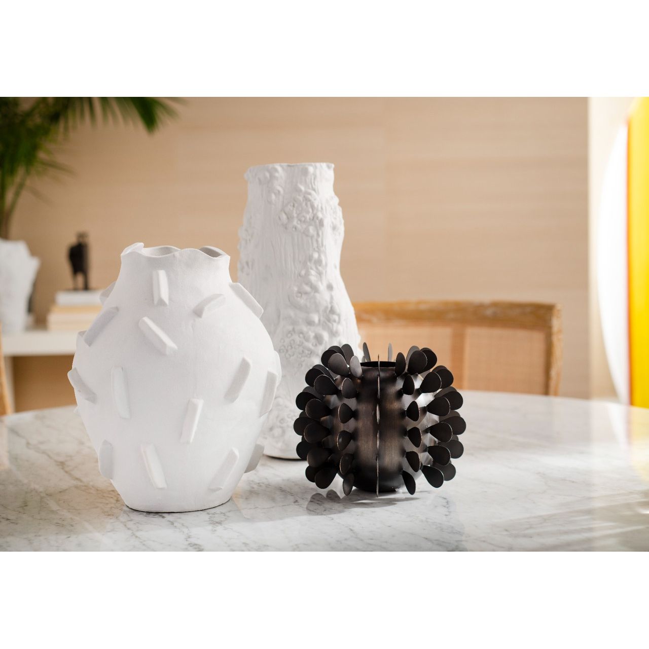 Le grand vase Bracque présente une surface lisse ornée de barres triangulaires qui projettent de magnifiques ombres. La dernière collection de porcelaine Blanc de Chine – nom français donné au XIXe siècle à la porcelaine chinoise d'un blanc immaculé, produite par Bungalow 5 – s'inspire profondément des formes organiques de la nature. À la fois abstrait et résolument moderne, le Bracque s'inspire de la vie marine, de l'art contemporain et du jeu des formes et des ombres. Ce vase est parfait en centre de table, accompagné de fleurs à longues tiges, ou présenté sans fleurs, comme un récipient vide.
