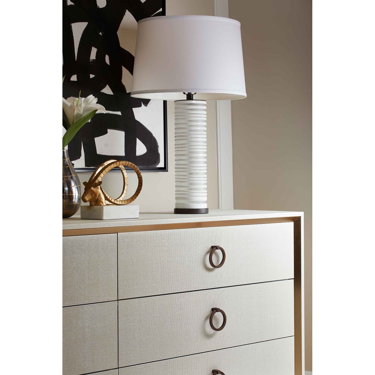 Dans le style glorifié des anciens Égyptiens pour sculpter le buste d'un grand pharaon, la statue de la Corne Spirale représente le bouquetin, roi des Alpes. Cette créature fantastique porte ses cornes comme une couronne, et elles sont ici façonnées pour un effet majestueux et spectaculaire. Les artisans de Villa & House ont adopté le naturalisme romantique des artistes du début du XXe siècle, qui puisaient dans le règne animal des sujets évoquant le mystère et les contrées lointaines. Une géométrie audacieuse et des courbes exagérées confèrent à la Corne Spirale une silhouette saisissante, idéale pour un bureau ou une étagère, tandis que sa riche finition dorée à la feuille et son socle en marbre blanc la valorisent comme un symbole de statut social.