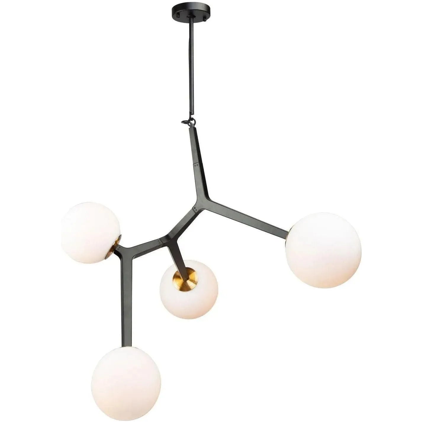 La collection Ravello comprend des cadres noirs d'aspect naturel de style organique avec de la verrerie opale circulaire avec des tasses en laiton de récolte. 4 lumière Suspension montré.