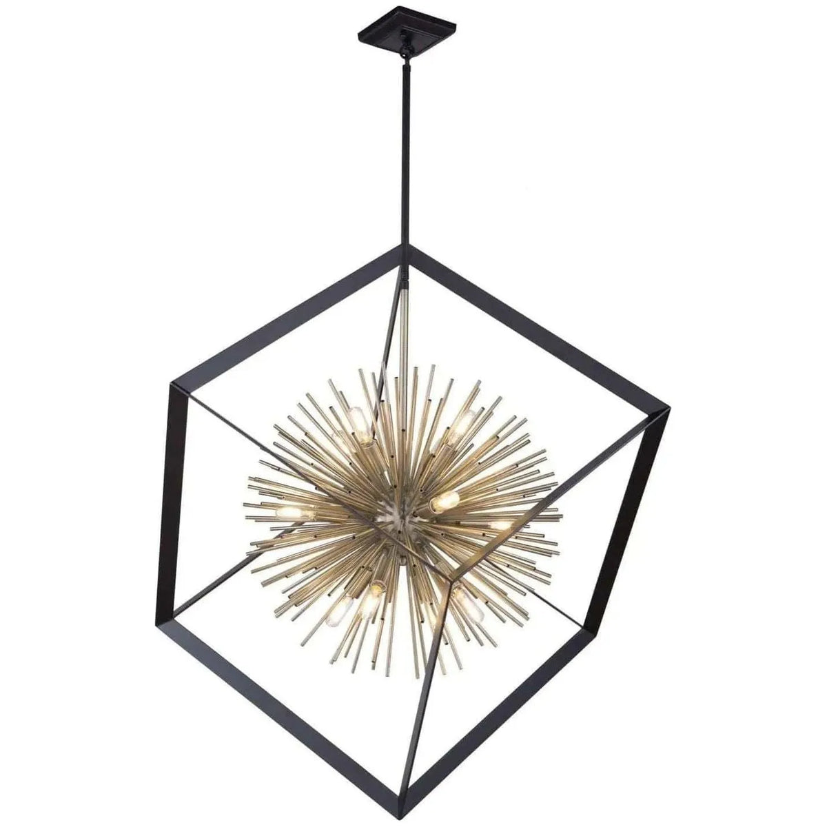 Finish: Matte Black & Satin Brass Material: Metal Dimensions: 37.00" W x 37.00" L x 38.00" H Weight: 18.74 lbs. Canopy Size: 5" x 5" x 1.5" Bulbs: 12 x Candelabra E12 Candelabra 60.00W, Dimmable Chain: 3x12" + 1x6" Collection: Sunburst